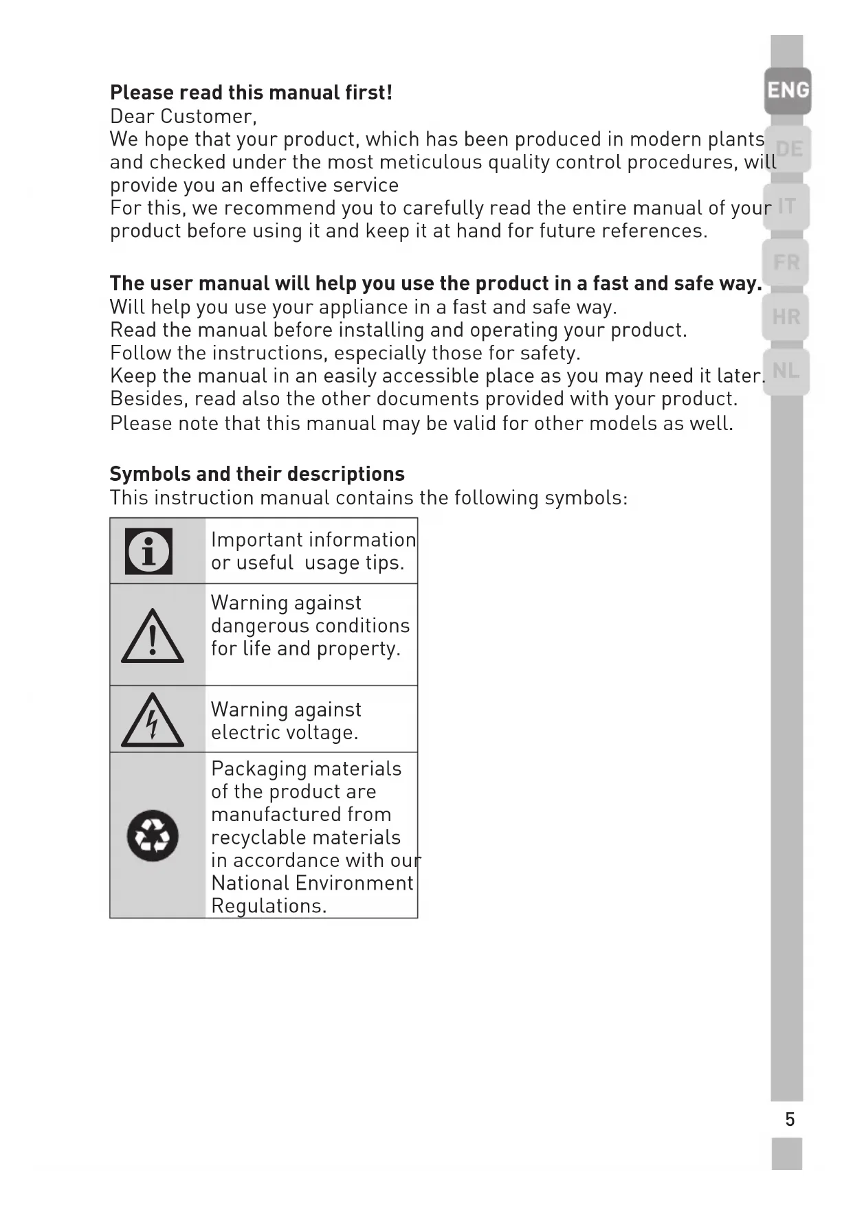 Please read this manual first! Dear Customer, We hope that your product, which has been produced in modern plants and checked under the most meticulous quality control procedures, will provide you an effective service For this, we recommend you to carefully read the entire manual of your product before using it and keep it at hand for future references. The user manual will help you use the product in a fast and safe way. Will help you use your appliance in a fast and safe way. Read the manual before installing and operating your product. Follow the instructions, especially those for safety. Keep the manual in an easily accessible place as you may need it later. Besides, read also the other documents provided with your product. Please note that this manual may be valid for other models as well. Symbols and their descriptions This instruction manual contains the following symbols: