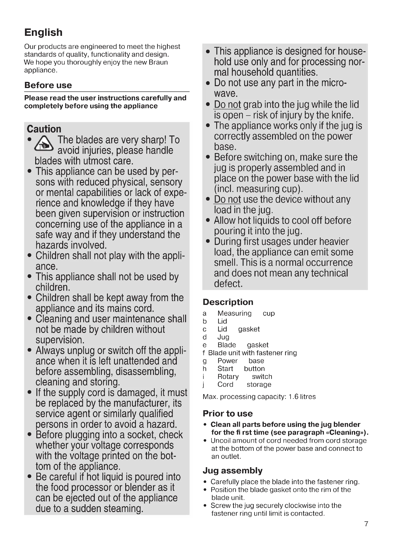 - For preparing small amounts of foodstuff use a low speed level. Cleaning Power base Do not immerse the power base in water. Wipe clean with a damp cloth only. Easy cleaning/rinsing of assembled jug After emptying the jug, fi ll it with water. Place it on the power base and turn the rotary switch to the «» setting several times. Empty the jug and rinse clean. Thoroughly cleaning the disassembled jug Make sure the jug is empty before you unscrew the fastener ring (f). Handle the blade with caution. All detachable parts are dishwasher-safe. For an effi cient cleaning of the lid, remove the lid gasket (c). Subject to change without notice. Please do not dispose of the product in the household waste at the end of its useful life. Disposal can take place at a Braun Service Centre or at appropriate collection points provided in your country.9 UK Only Guarantee Information All Braun Household products carry a minimum guarantee period of two years . The rights and benefi ts under this guarantee are additional to your statutory rights which are not aff ected. Please keep your receipt as this will form the basis of your guarantee. In the unlikely event of a breakdown you have access to professional help from our team simply by calling: