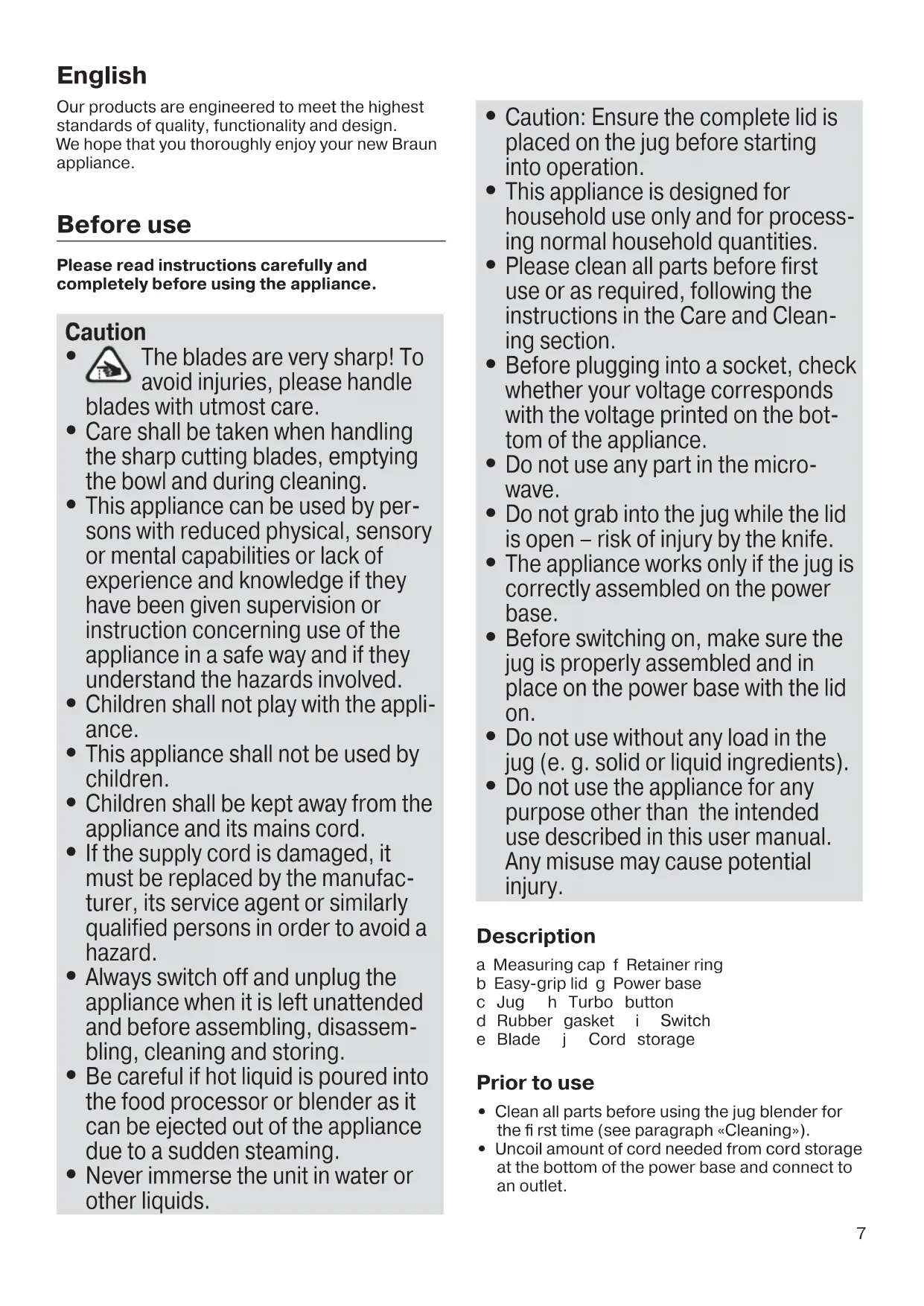 Do not use the appliance for any purpose other than the intended use described in this user manual. Any misuse may cause potential injury. Description a Measuring cap f Retainer ring b Easy-grip lid g Power base c Jug h Turbo button d Rubber gasket i Switch e Blade j Cord storage Prior to use