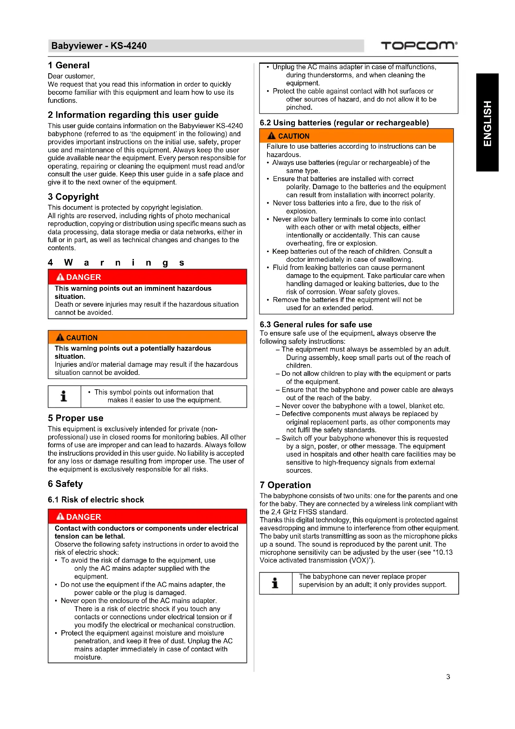 1 General Dear customer, We request that you read this information in order to quickly become familiar with this equipment and learn how to use its functions. 2 Information regarding this user guide This user guide contains information on the Babyviewer KS-4240 babyphone (referred to as ‘the equipment’ in the following) and provides important instructions on the initial use, safety, proper use and maintenance of this equipment. Always keep the user guide available near the equipment. Every person responsible for operating, repairing or cleaning the equipment must read and/or consult the user guide. Keep this user guide in a safe place and give it to the next owner of the equipment. 3 Copyright This document is protected by copyright legislation. All rights are reserved, including rights of photo mechanical reproduction, copying or distribution using specific means such as data processing, data storage media or data networks, either in full or in part, as well as technical changes and changes to the contents. 4Warnings 5 Proper use This equipment is exclusively intended for private (non- professional) use in closed rooms for monitoring babies. All other forms of use are improper and can lead to hazards. Always follow the instructions provided in this user guide. No liability is accepted for any loss or damage resulting from improper use. The user of the equipment is exclusively responsible for all risks. 6 Safety