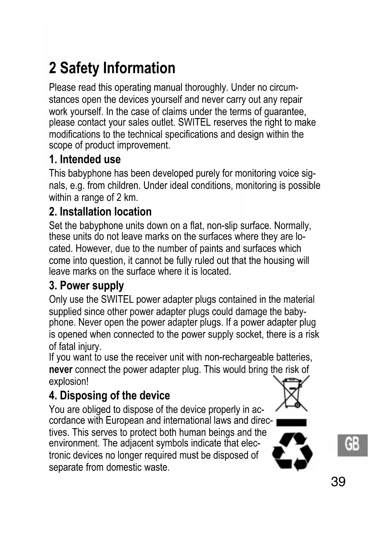 Only use the SWITEL power adapter plugs contained in the material supplied since other power adapter plugs could damage the baby-phone. Never open the power adapter plugs. If a power adapter plug is opened when connected to the power supply socket, there is a risk of fatal injury.