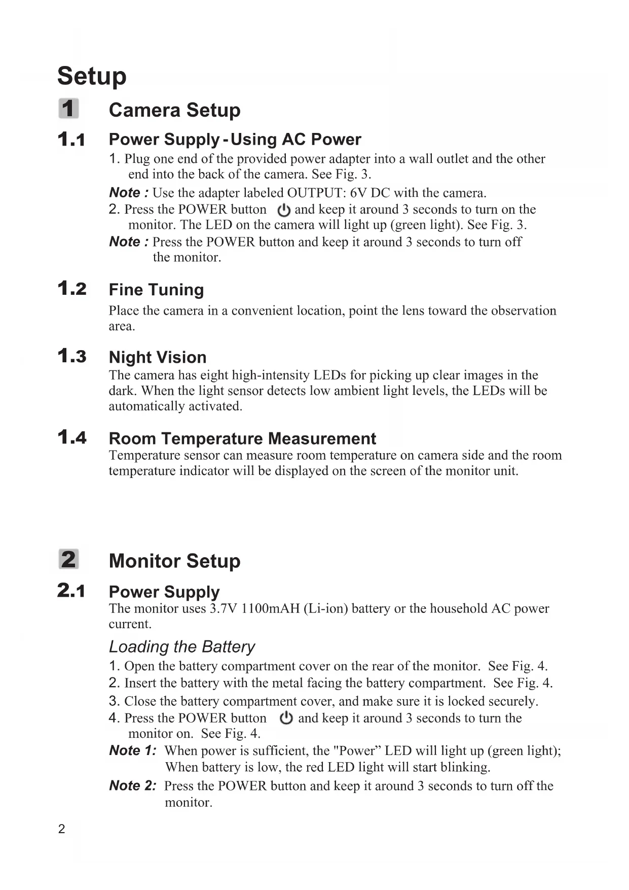 - Press the POWER button ⏻ and keep it around 3 seconds to turn on the monitor. The LED on the camera will light up (green light). See Fig. 3.