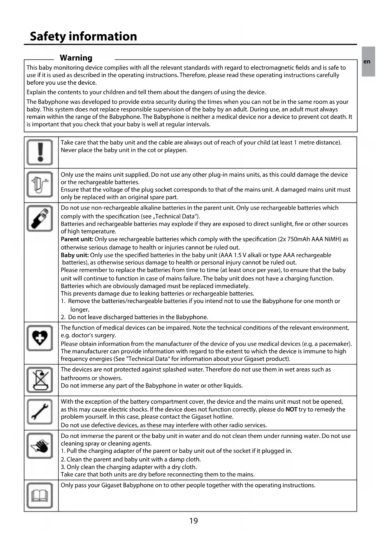 The function of medical devices can be impaired. Note the technical conditions of the relevant environment, e.g. doctor‘s surgery. Please obtain information from the manufacturer of the device of you use medical devices (e.g. a pacemaker). The manufacturer can provide information with regard to the extent to which the device is immune to high frequency energies (See ”Technical Data“ for information about your Gigaset product). The devices are not protected against splashed water. Therefore do not use them in wet areas such as bathrooms or showers. Do not immerse any part of the Babyphone in water or other liquids. With the exception of the battery compartment cover, the device and the mains unit must not be opened, as this may cause electric shocks. If the device does not function correctly, please do NOT try to remedy the problem yourself. In this case, please contact the Gigaset hotline. Do not use defective devices, as these may interfere with other radio services. Do not immerse the parent or the baby unit in water and do not clean them under running water. Do not use cleaning spray or cleaning agents.
