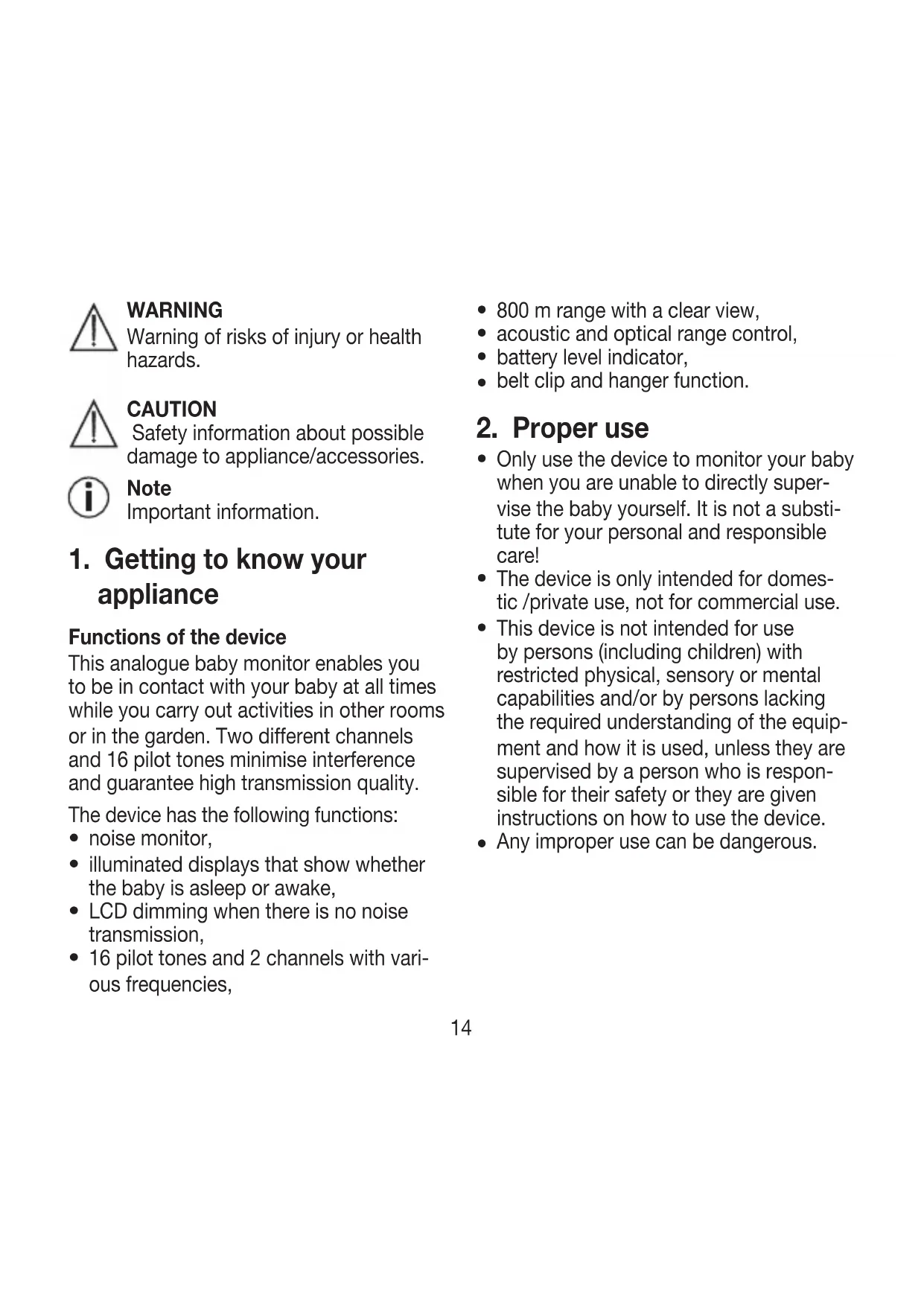 appliance Functions of the device This analogue baby monitor enables you to be in contact with your baby at all times while you carry out activities in other rooms or in the garden. Two different channels and 16 pilot tones minimise interference and guarantee high transmission quality. The device has the following functions: