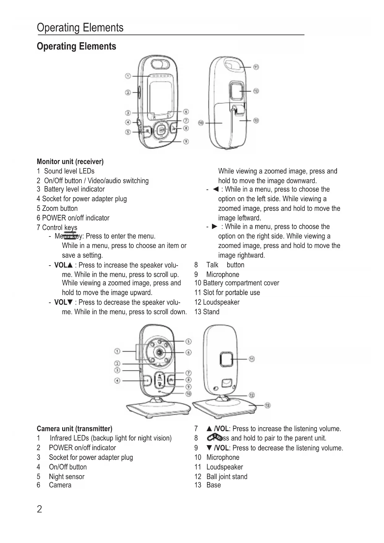 Setting the brightness Press the Menu key. Press VOL▲ or VOL▼to select . Press ◄ or ► to select the desired brightness. Press the Menu key. Setting the sound sensitivity You can adjust the microphone sensitivity of the transmitter. The higher the sensitivity level, the more sensitive the transmitter is in detecting sounds for transmitting to the receiver. Press the Menu key. Press VOL▲ or VOL▼to select . Press ◄ or ► to select the desired sentitivity (highest sensitivity level: ). Press the Menu key. Note that when the highest sensitivity level (5) is selected then this will override the sound activation function and the screen on the parent unit will remain active continuously. The default setting is level 4. Setting the sound activation The receiver continuously monitors the sound level in your baby’s room. When the sound activation mode is on, the receiver screen turns on when the transmitter detects a sound. As long as no sound is detected within 50 seconds, the receiver screen is off to save power. When your baby starts to cry, the sound activation triggers the receiver screen automatically turns on. Press the Menu key. Press VOL▲ or VOL▼to select . Press ◄ or ► to switch the sound activation on ( ) or off ( ). Press the Menu key. Selecting the transmitter (camera) If two or more transmitters (cameras) are registered to your receiver, you can select the active came- raor start automatic switching (Patrol Mode). Press the Menu key. Press VOL▲ or VOL▼to select . Press ◄ or ► to change the active camera (1, 2, 3 or 4) or start the Patrol Mode ( ). If you select Patrol Mode to view the images, the screen switches to view another transmitter automatically after some time. The switching is in chronological order: 1…4. Press the Menu key. Putting an additional transmitter (camera) into service The receiver allows you the possibility to register up to four transmitters (cameras) simultaneously, and to manually change or automatically switch between them. The delivered camera is already registered with your receiver. Press Menu/Select. Press VOL▲ or VOL▼to select and press the Menu key. Follow the full instructions that accompany your new transmitter (camera). Operating the Receiver8 Appendix Safety Information Please read this operating instruction manual thoroughly. Intended use The surveillance system has been developed to monitor rooms. The transmitter sends acoustic and video signals from its point of installation to the receiver. Any other use is considered unintended use. The use of this equipment does not substitute personal supervision, e.g. of a child. Users are not relieved of their personal liability. Unauthorised modification or reconstruction is not permitted. Under no circumstances open the device or complete any repair work yourself. Installation location and safety information
