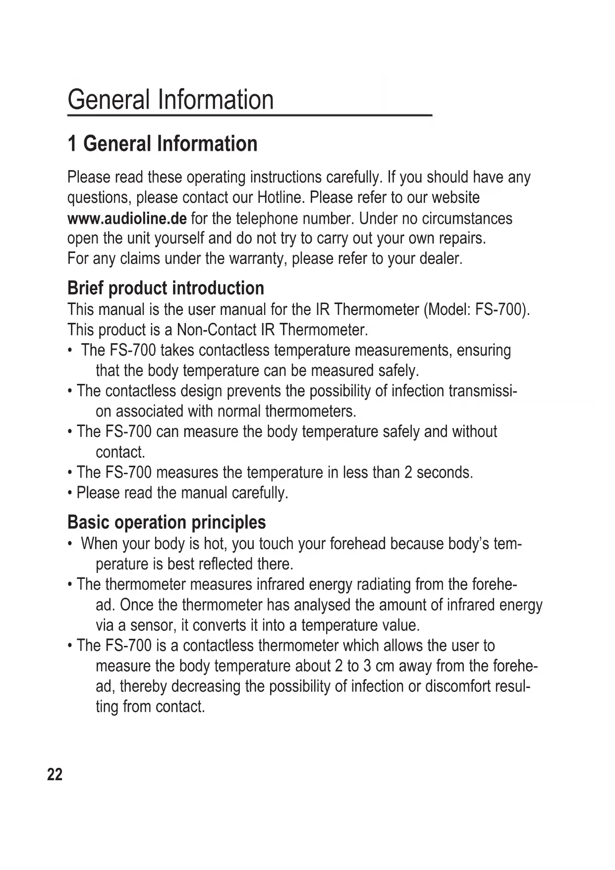 1 General Information Please read these operating instructions carefully. If you should have any questions, please contact our Hotline. Please refer to our website www.audioline.de for the telephone number. Under no circumstances open the unit yourself and do not try to carry out your own repairs. For any claims under the warranty, please refer to your dealer. Brief product introduction This manual is the user manual for the IR Thermometer (Model: FS-700). This product is a Non-Contact IR Thermometer.