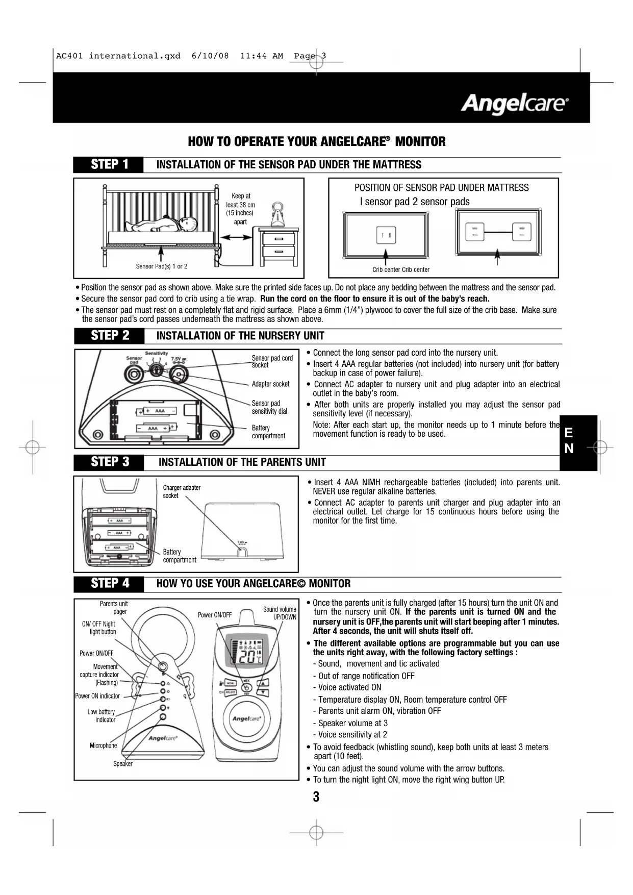 LIMITED WARRANTY Angelcare® warrants to the original owner of this product that Angelcare® rechargeable movement and sound monitor (model AC401) is free from any material and workmanship defects, for a period of one (1) year from the date of the original purchase. If this monitoring system fails to function properly when used as directed under normal conditions within the one-year period, Angelcare® will either repair or replace the product, at our discretion, free of charge. Please contact your distributor. The product must be accompanied by a proof of purchase, either a bill of sale or other proof that the monitoring system is within the warranty period. Angelcare® will bear the cost of repairing or replacing the product and shipping it back to you. This warranty does not apply to a product which has been damaged as a result of improper maintenance, an accident, improper voltage supply or an y other form of misuse. The warranty is also void if the owner repairs or modifies the product in any way. Angelcare® is not liable for any incidental or consequential damages with regard to this product. The warranty also excludes any liability other than what is stated above. No other warranty is given. LEGAL RIGHTS VARY FROM COUNTRY TO COUNTRY. SOME COUNTRIES DO NOT ALLOW THE EXCLUSION OR LIMITATION OF INCIDENTAL OR CONSEQUENTIAL DAMAGES, SO THE ABOVE LIMITATIONS MAY NOT APPLY TO YOU. WE ARE NOT IN ANY WAY RESPONSIBLE FOR ANY OUTCOME RESULTING FROM THE USE OF THIS PRODUCT. IMPORTANT! This Angelcare® monitor is a personal care product. Please do not return this product to the store. If you have questions or need help, please call your distributor before returning this product. This device complies with Part 15 of the FCC Rules. Operation is subject to the following two conditions: (1) this device may not cause harmful interference; and (2) this device must accept any interference received, including interference that may cause undesired operation. Warning: Changes or modifications to this equipment not expressly approved by the party responsible for compliance could void the user's authority to operate the equipment. NOTE: This equipment has been tested and found to comply with the limits for a Class B digital device, pursuant to Part 15 of the FCC Rules. These limits are designed to provide reasonable protection against harmful interference in a residential installation. This equipment generates, uses and can radiate radio frequency energy and,if not installed and used in accordance with the instructions, may cause harmful interference to radio communications. However, there is no guarantee that interference will not occur in a particular installation. If this equipment does cause harmful interference to radio or television reception, which can be determined by turning the equipment off and on, the user is encouraged to try to correct the interference by one or more of the following measures: - Reorient or relocate the receiving antenna. - Increase the separation between the equipment and receiver. - Connect the equipment into an outlet on a circuit different from that to which the receiver is needed. - Consult the dealer or an experienced radio/TV technician for help. CAUTION: - To reduce the risk of electric shock, do not expose this appliance to rain or moisture. - Danger of explosion if battery is incorrectly replaced. The included batteries are 4 AAA NIMH rechargeable batteries manufactured by Sanik Battery Co. Ltd. SN-AAA60HJ 1.2V 600mAh and by GPI International Limited, GN60AAAHC, 1.2V 600mAh. They may only be replaced by 4 AAA NIMH rechargeable batteries. Transmission: 927 MHz (USA and Canada) 864 MHz (Europe, Asia, Africa, Oceania) Data transmission between the parents unit and nursery unit is made on the 2.4GHz frequency. Protect the environment! This electronic equipment contains reusable material and must not be disposed with domestic waste. Please take it to a collecting point for electric and electronic equipment (ask your local authorities for details). AC401 international.qxd 6/10/08 11:44 AM Page 89