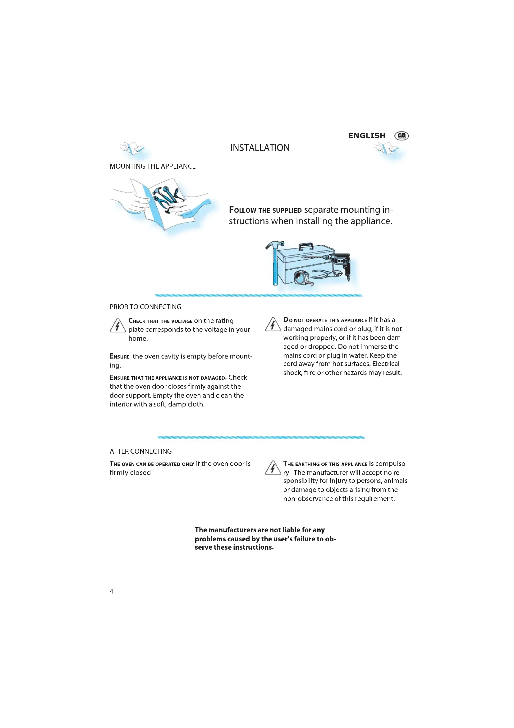 FOLLOW THE SUPPLIED separate mounting in- structions when installing the appliance. ENGLISH GB5 ONLY ALLOW CHILDREN to use the appliance under adult supervision and after ade- quate instructions have been given, so that the child is able to use the appliance in a safe way and understands the hazards of improper use.