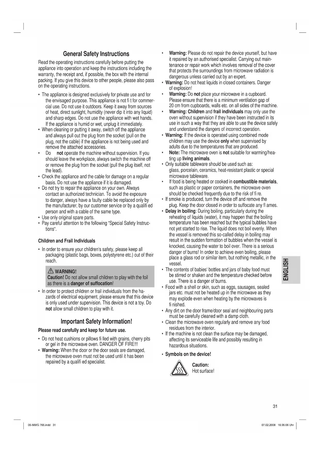 - If you need to replace the lighting in the oven, please contact a specialist workshop near you. Technical Data Model: ............................................................................ MWG 765 Power supply: .....................................................220-240 V, 50 Hz Power consumption: microwave: ...................................................................1150 W grill: ...............................................................................800 W Rated microwave power output: ........................ 700 W/2450 MHz Cavity volume: ................................................................... 17 litres Protection class: ........................................................................... Ι Net weight: .........................................................................10,8 kg This device has been tested according to all relevant current CE guidelines, such as electromagnetic compatibility and low voltage directives, and has been constructed in accordance with the latest safety regulations. Subject to technical changes without prior notice! Guarantee The device supplied by our Company is covered by a 24 month guarantee starting on the date of purchase (receipt). During the life of the guarantee any fault of the device or its accessories ascribable to material or manufacturing defects will be eliminated free of charge by repairing or, at our discretion, by replacing it. The guarantee services do not entail an extension of the life of the guarantee nor do they give rise to any right to a new guarantee! Proof of the guarantee is provided by the proof of purchase. Without proof of purchase no free replacement or repair will be carried out. If you wish to make a claim under the guarantee please return the entire machine in the original packaging to your dealer together with the receipt. Defects to consumables or parts subject to wearing as well as cleaning, maintenance or the replacement of said parts are not covered by the guarantee and hence are to be paid! The guarantee lapses in case of unauthorized tampering. After the expiry of the guarantee After the expiry of the guarantee repairs can be carried by the competent dealer or repair service against the payment of the ensuing costs. 05-MWG 765.indd 3305-MWG 765.indd 33 07.02.2008 16:35:07 Uhr07.02.2008 16:35:07 UhrENGLISH ENGLISH