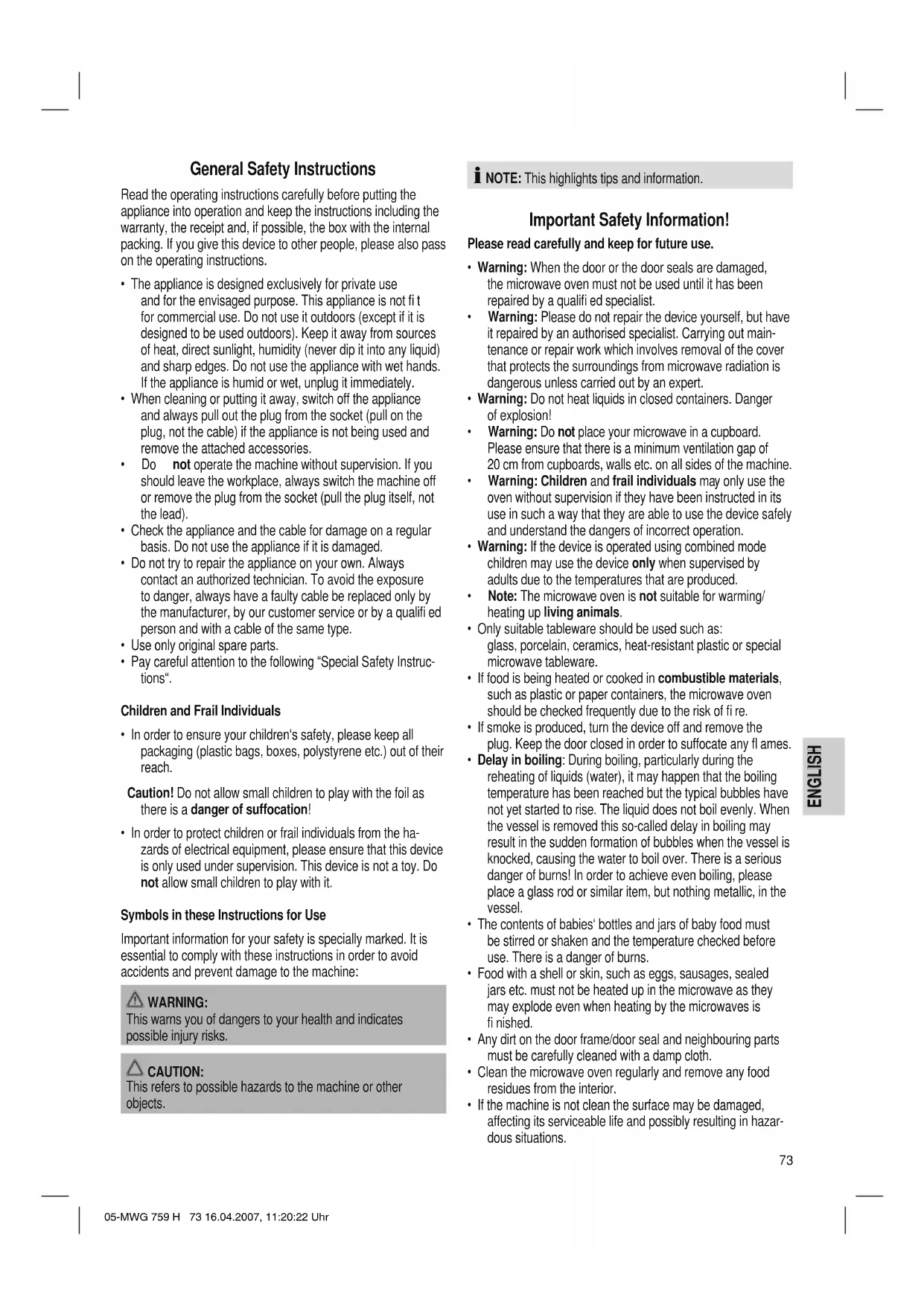 - If the machine is not clean the surface may be damaged, affecting its serviceable life and possibly resulting in hazar- dous situations. 05-MWG 759 H 73 16.04.2007, 11:20:22 UhrENGLISH ENGLISH