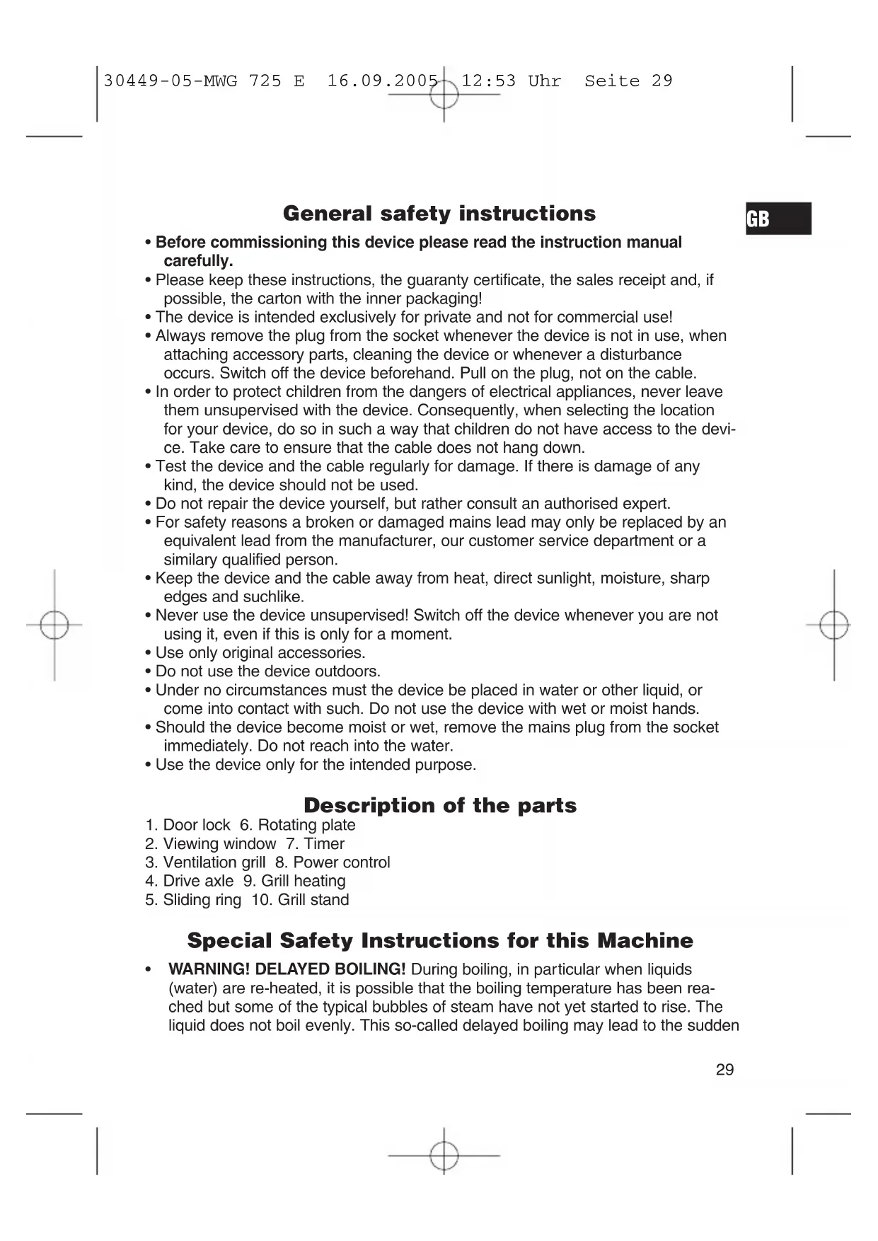 30449-05-MWG 725 E 16.09.2005 12:53 Uhr Seite 29formation of bubbles of steam and boiling over when the vessel is removed and slightly shaken. There is a danger of scalding! So that boiling is even, place a glass rod or the like - but nothing metal - into the vessel.