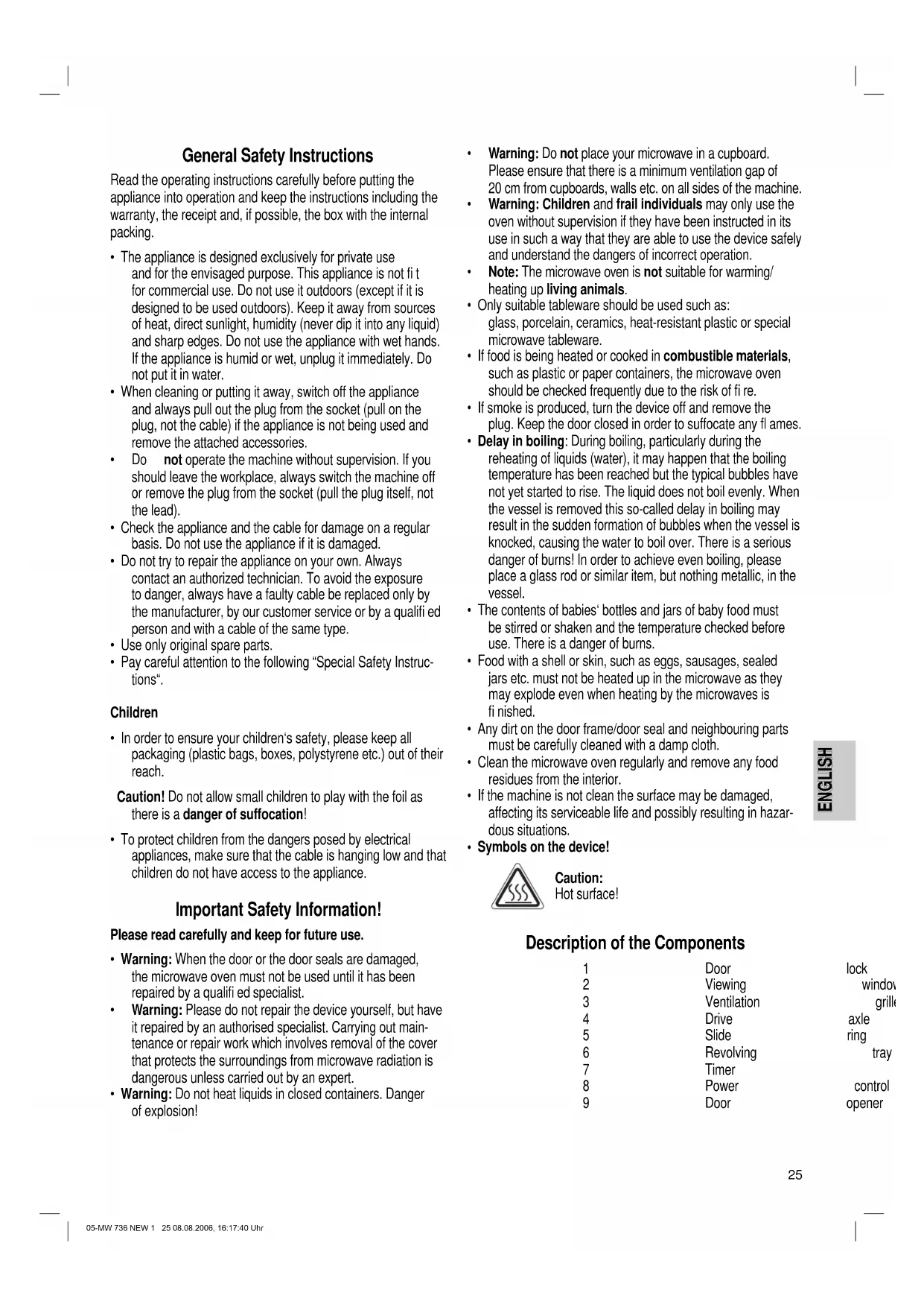 - If you need to replace the lighting in the oven, please contact a specialist workshop near you. Technical Data Model: ..............................................................................MW 736 Power supply:............................................................230 V, 50 Hz Power consumption:...........................................................1150 W Rated microwave power output:........................ 800 W/2450 MHz Cavity volume:..................................................................20 litres Protection class:........................................................................... Ι This device has been tested according to all relevant current CE guidelines, such as electromagnetic compatibility and low voltage directives, and has been constructed in accordance with the latest safety regulations. Subject to technical changes without prior notice! Guarantee The device supplied by our Company is covered by a 24 month guarantee starting on the date of purchase (receipt). During the life of the guarantee any fault of the device or its accessories ascribable to material or manufacturing defects will be eliminated free of charge by repairing or, at our discretion, by replacing it. The guarantee services do not entail an extension of the life of the guarantee nor do they give rise to any right to a new guarantee! Proof of the guarantee is provided by the proof of purchase. Without proof of purchase no free replacement or repair will be carried out. If you wish to make a claim under the guarantee please return the entire machine in the original packaging to your dealer together with the receipt. Defects to consumables or parts subject to wearing as well as cleaning, maintenance or the replacement of said parts are not covered by the guarantee and hence are to be paid! The guarantee lapses in case of unauthorized tampering. After the expiry of the guarantee After the expiry of the guarantee repairs can be carried by the competent dealer or repair service against the payment of the ensuing costs. Meaning of the “Dustbin” Symbol Protect our environment: do not dispose of electrical equipment in the domestic waste. Please return any electrical equipment that you will no longer use to the collection points provided for their disposal. This helps avoid the potential effects of incorrect disposal on the environment and human health. This will contribute to the recycling and other forms of reutilisati- on of electrical and electronic equipment. Information concerning where the equipment can be disposed of can be obtained from your local authority. 05-MW 736 NEW 1 27 08.08.2006, 16:17:45 Uhr28