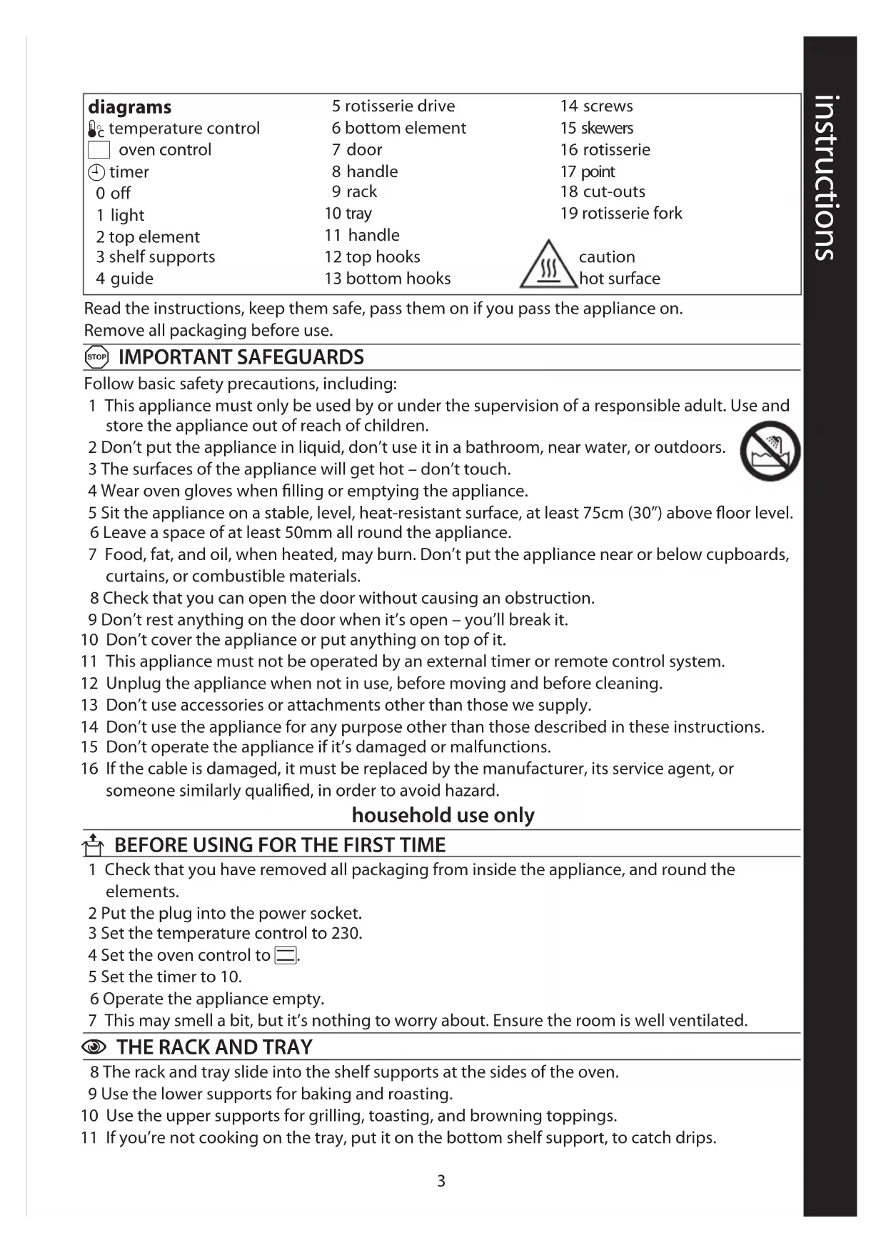 Follow basic safety precautions, including: 1 This appliance must only be used by or under the supervision of a responsible adult. Use and store the appliance out of reach of children. 2 Don’t put the appliance in liquid, don’t use it in a bathroom, near water, or outdoors. 3 The surfaces of the appliance will get hot – don’t touch. 4 Wear oven gloves when filling or emptying the appliance. 5 Sit the appliance on a stable, level, heat-resistant surface, at least 75cm (30”) above floor level. 6 Leave a space of at least 50mm all round the appliance. 7 Food, fat, and oil, when heated, may burn. Don’t put the appliance near or below cupboards, curtains, or combustible materials. 8 Check that you can open the door without causing an obstruction. 9 Don’t rest anything on the door when it’s open – you’ll break it. 10 Don’t cover the appliance or put anything on top of it. 11 This appliance must not be operated by an external timer or remote control system. 12 Unplug the appliance when not in use, before moving and before cleaning. 13 Don’t use accessories or attachments other than those we supply. 14 Don’t use the appliance for any purpose other than those described in these instructions. 15 Don’t operate the appliance if it’s damaged or malfunctions. 16 If the cable is damaged, it must be replaced by the manufacturer, its service agent, or someone similarly qualified, in order to avoid hazard. household use only U BEFORE USING FOR THE FIRST TIME 1 Check that you have removed all packaging from inside the appliance, and round the elements. 2 Put the plug into the power socket. 3 Set the temperature control to 230. 4 Set the oven control to H. 5 Set the timer to 10. 6 Operate the appliance empty. 7 This may smell a bit, but it’s nothing to worry about. Ensure the room is well ventilated.
