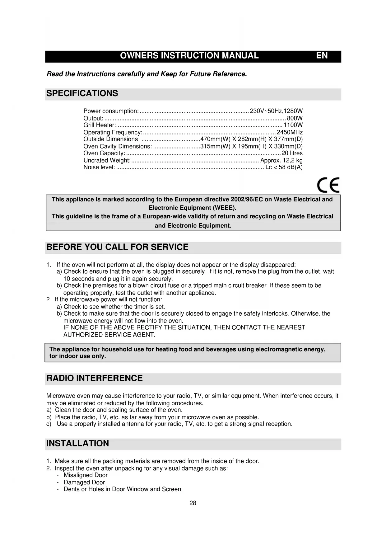 a) Check to see whether the timer is set. b) Check to make sure that the door is securely closed to engage the safety interlocks. Otherwise, the microwave energy will not flow into the oven. IF NONE OF THE ABOVE RECTIFY THE SITUATION, THEN CONTACT THE NEAREST AUTHORIZED SERVICE AGENT. RADIO INTERFERENCE Microwave oven may cause interference to your radio, TV, or similar equipment. When interference occurs, it may be eliminated or reduced by the following procedures. a) Clean the door and sealing surface of the oven. b) Place the radio, TV, etc. as far away from your microwave oven as possible. c) Use a properly installed antenna for your radio, TV, etc. to get a strong signal reception. INSTALLATION
