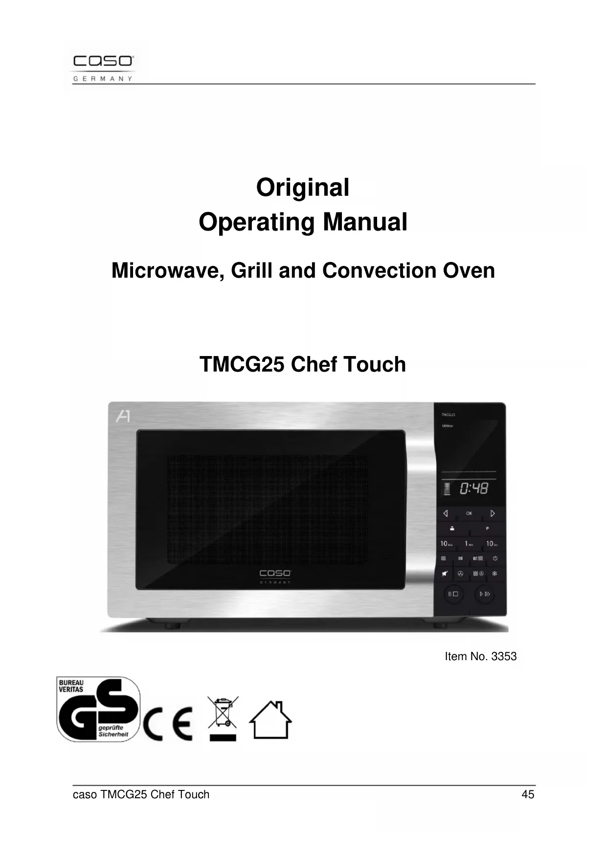 Download the instructions for your Microwave Oven in PDF format for free! Find your manual TMCG25 Chef Touch - CASO and take your electronic device back in hand. On this page are published all the documents necessary for the use of your device. TMCG25 Chef Touch by CASO.