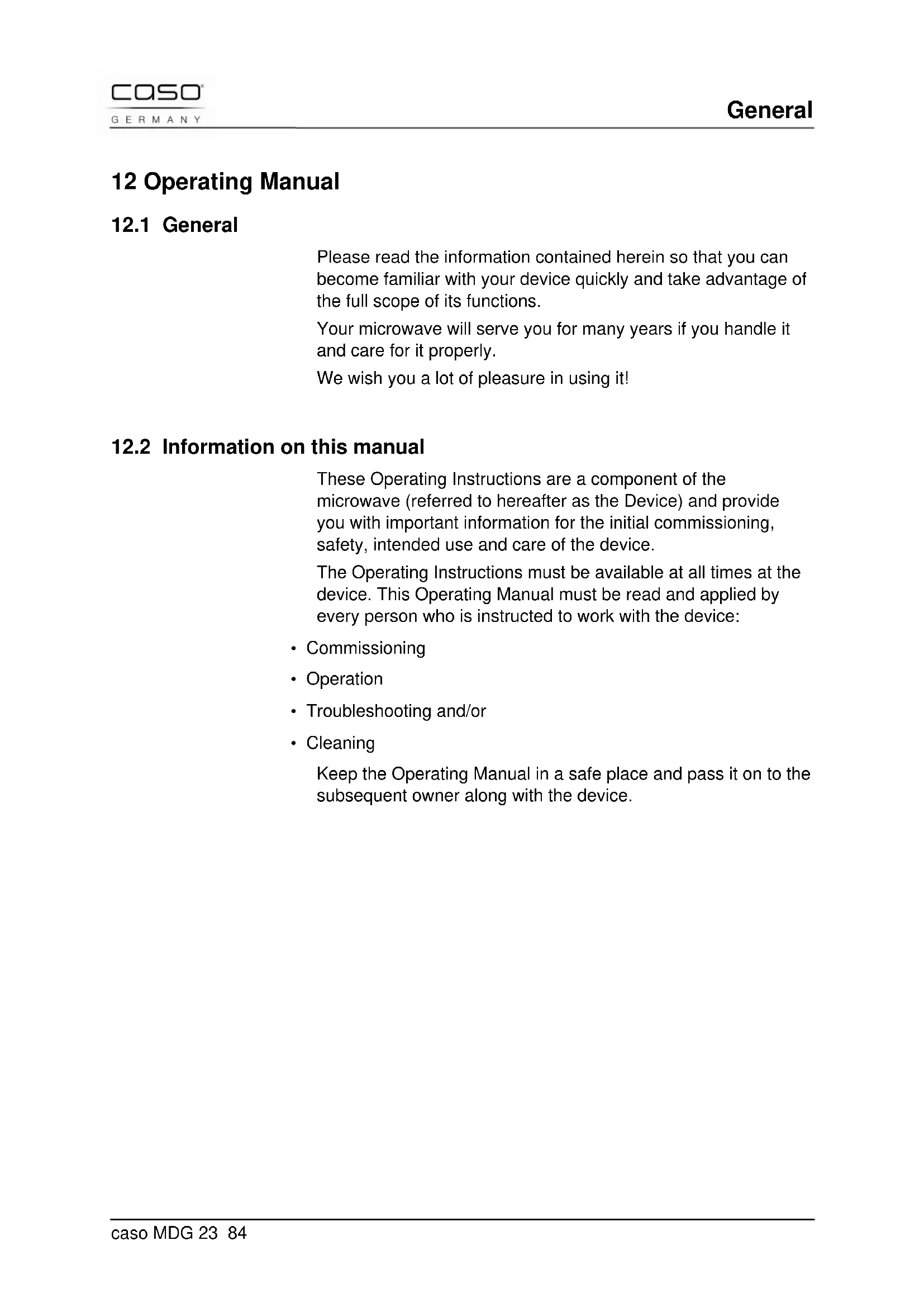 - Cleaning Keep the Operating Manual in a safe place and pass it on to the subsequent owner along with the device.General caso MDG 23 85