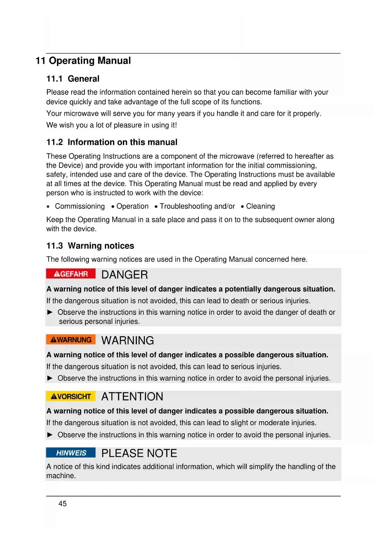 These Operating Instructions are a component of the microwave (referred to hereafter as the Device) and provide you with important information for the initial commissioning, safety, intended use and care of the device. The Operating Instructions must be available at all times at the device. This Operating Manual must be read and applied by every person who is instructed to work with the device: Commissioning Operation Troubleshooting and/or Cleaning Keep the Operating Manual in a safe place and pass it on to the subsequent owner along with the device.