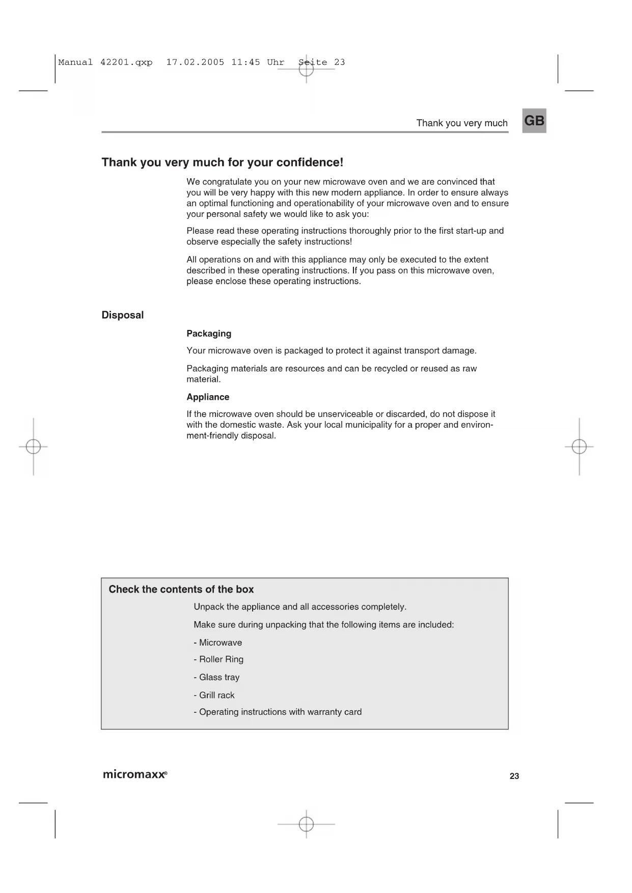 Thank you very much for your confidence! We congratulate you on your new microwave oven and we are convinced thatyou will be very happy with this new modern appliance. In order to ensure alwaysan optimal functioning and operationability of your microwave oven and to ensureyour personal safety we would like to ask you:Please read these operating instructions thoroughly prior to the first start-up andobserve especially the safety instructions!All operations on and with this appliance may only be executed to the extent described in these operating instructions. If you pass on this microwave oven,please enclose these operating instructions. Disposal PackagingYour microwave oven is packaged to protect it against transport damage.Packaging materials are resources and can be recycled or reused as raw material.ApplianceIf the microwave oven should be unserviceable or discarded, do not dispose itwith the domestic waste. Ask your local municipality for a proper and environ-ment-friendly disposal. Check the contents of the box Unpack the appliance and all accessories completely.Make sure during unpacking that the following items are included:- Microwave- Roller Ring- Glass tray- Grill rack- Operating instructions with warranty card Manual 42201.qxp 17.02.2005 11:45 Uhr Seite 23Safety instructions