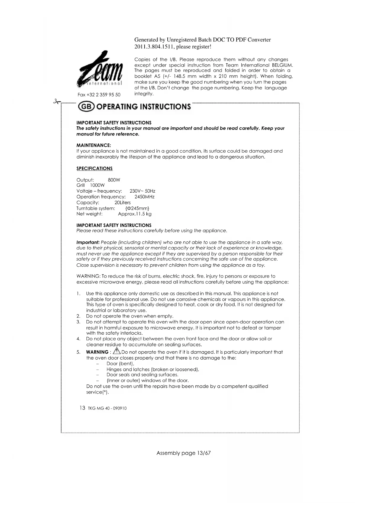 wipe the bottom surface of the oven with mild detergent. The roller ring may be washed inGenerated by Unregistered Batch DOC TO PDF Converter 2011.3.804.1511, please register! Copies of the I/B. Please reproduce them without any changes except under special instruction from Team International BELGIUM. The pages must be reproduced and folded in order to obtain a booklet A5 (+/- 148.5 mm width x 210 mm height). When folding, make sure you keep the good numbering when you turn the pages of the I/B. Don‟t change the page numbering. Keep the language integrity.