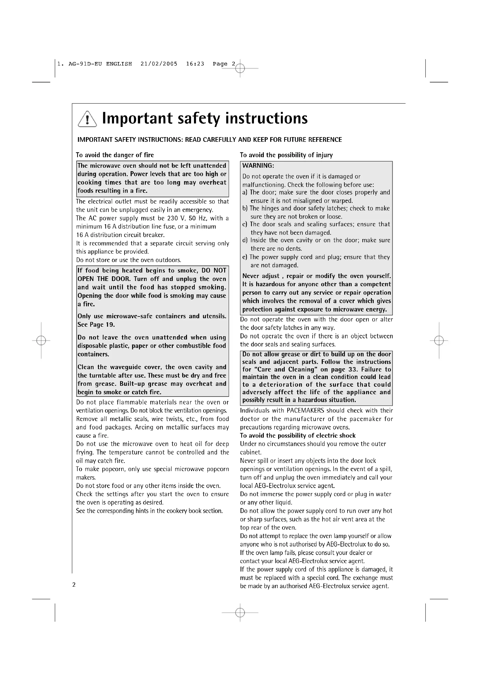 Do not operate the oven if it is damaged or malfunctioning. Check the following before use: a) The door; make sure the door closes properly and ensure it is not misaligned or warped. b) The hinges and door safety latches; check to make sure they are not broken or loose. c) The door seals and sealing surfaces; ensure that they have not been damaged. d) Inside the oven cavity or on the door; make sure there are no dents. e) The power supply cord and plug; ensure that they are not damaged. Never adjust , repair or modify the oven yourself. It is hazardous for anyone other than a competent person to carry out any service or repair operation which involves the removal of a cover which gives protection against exposure to microwave energy. Do not operate the oven with the door open or alter the door safety latches in any way. Do not operate the oven if there is an object between the door seals and sealing surfaces. Do not allow grease or dirt to build up on the door seals and adjacent parts. Follow the instructions for “Care and Cleaning” on page 33. Failure to maintain the oven in a clean condition could lead to a deterioration of the surface that could adversely affect the life of the appliance and possibly result in a hazardous situation. Individuals with PACEMAKERS should check with their doctor or the manufacturer of the pacemaker for precautions regarding microwave ovens. To avoid the possibility of electric shock Under no circumstances should you remove the outer cabinet. Never spill or insert any objects into the door lock openings or ventilation openings. In the event of a spill, turn off and unplug the oven immediately and call your local AEG-Electrolux service agent. Do not immerse the power supply cord or plug in water or any other liquid. Do not allow the power supply cord to run over any hot or sharp surfaces, such as the hot air vent area at the top rear of the oven. Do not attempt to replace the oven lamp yourself or allow anyone who is not authorised by AEG-Electrolux to do so. If the oven lamp fails, please consult your dealer or contact your local AEG-Electrolux service agent. If the power supply cord of this appliance is damaged, it must be replaced with a special cord. The exchange must be made by an authorised AEG-Electrolux service agent.