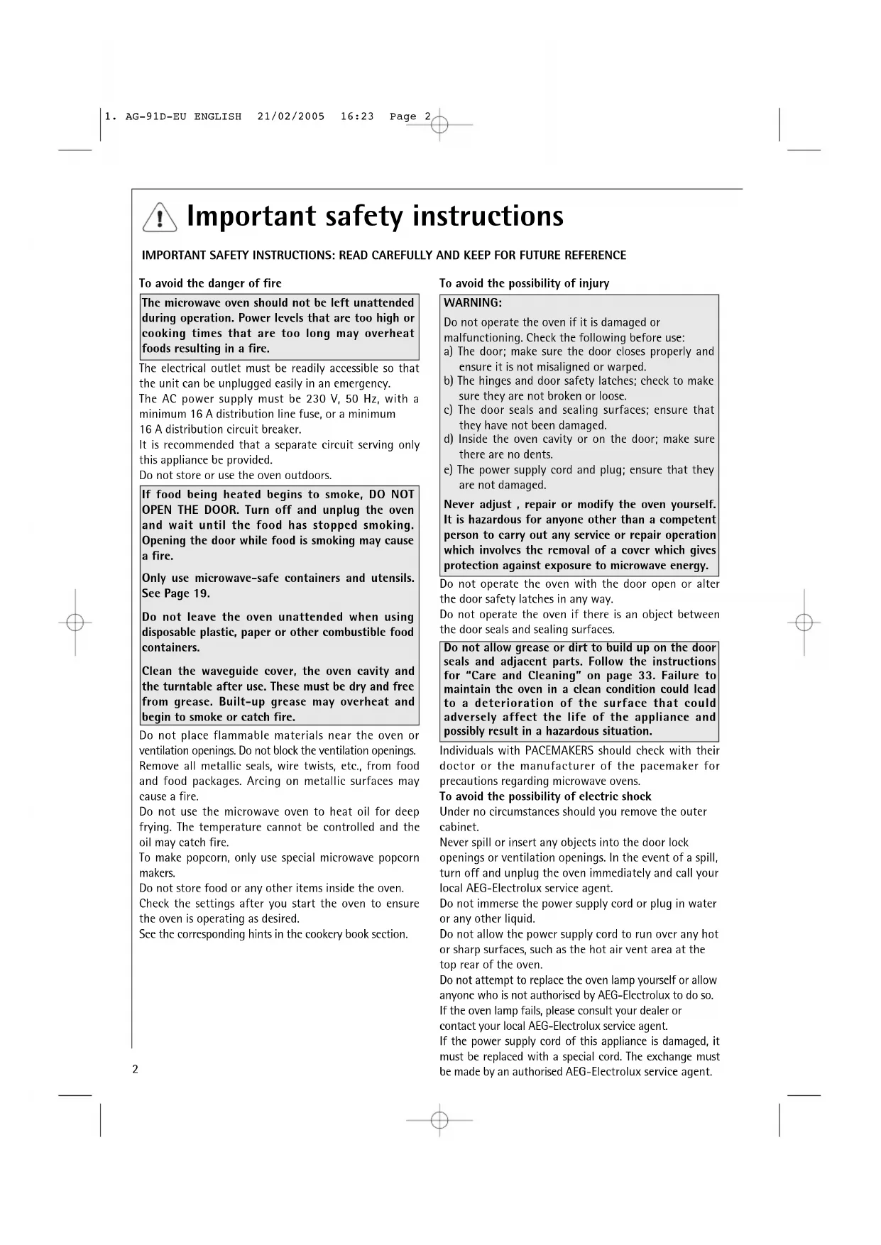 AG-91D-EU COVER 21/02/2005 16:20 Page ADear Customer, Thank you for buying an AEG-Electrolux microwave oven and putting your trust in the AEG-Electrolux brand name. Before using your AEG-Electrolux microwave oven for the first time, please read the instruction book thoroughly. This will enable you to take advantage of all the features that the appliance offers. It will also ensure trouble-free operation and minimize unnecessary service calls. Important information concerning your safety or the operation of your appliance is noted by this symbol and/or mentions words such as «Warning», «Take care». Be sure to follow all instructions carefully. Throughout the manual, this symbol guides you step by step when operating the appliance. This symbol indicates further information concerning the use of the appliance. The clover indicates energy-saving tips and hints for environmentally friendly use of your appliance. In the event of malfunctioning, please follow the instructions given in the section «What to do if...»