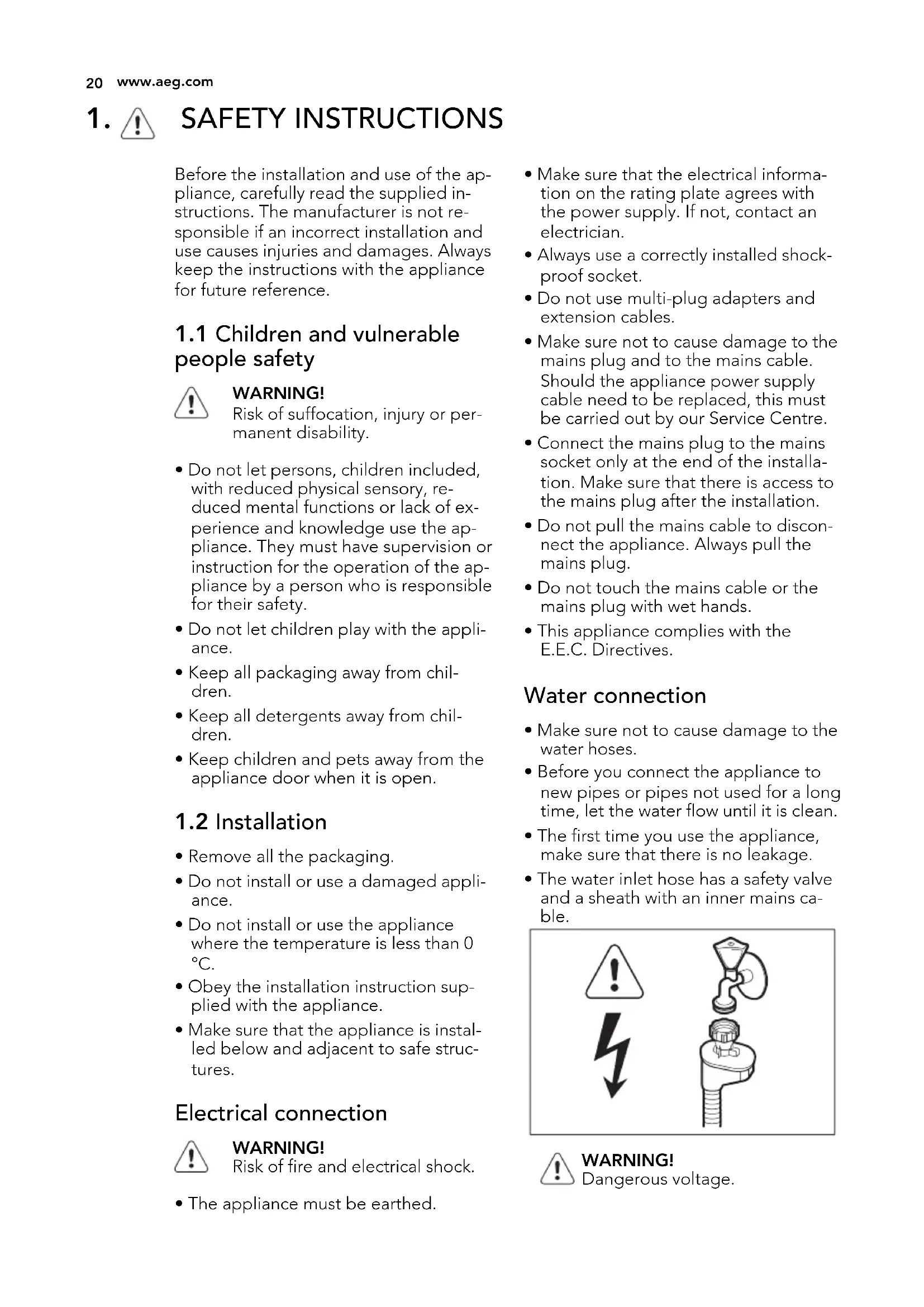 www.aeg.com• If the water inlet hose is damaged, im- mediately disconnect the mains plug from the mains socket. Contact the Service to replace the water inlet hose.