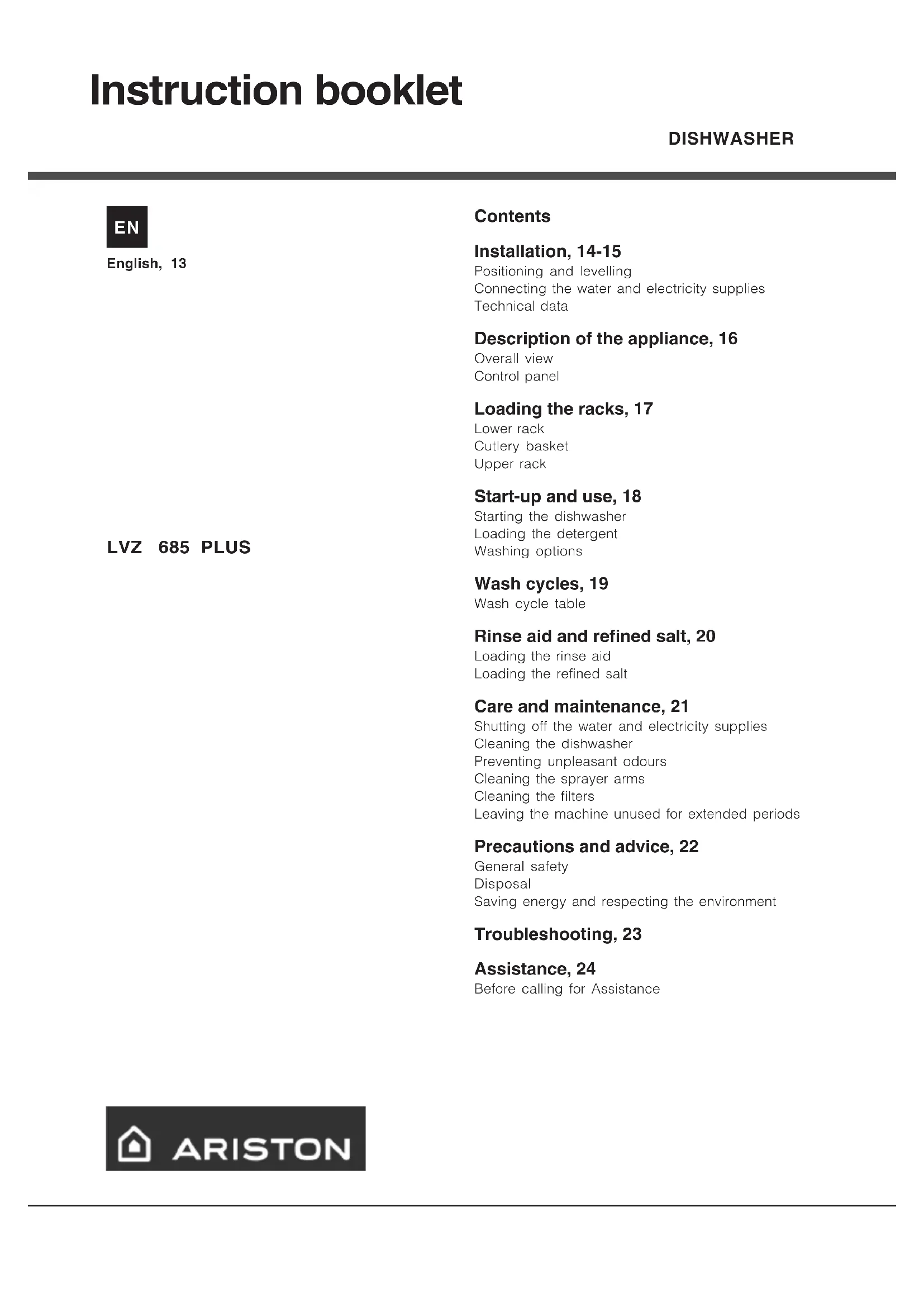 Download the instructions for your Dishwasher in PDF format for free! Find your manual LVZ 685 Plus - Ariston Thermo and take your electronic device back in hand. On this page are published all the documents necessary for the use of your device. LVZ 685 Plus by Ariston Thermo.