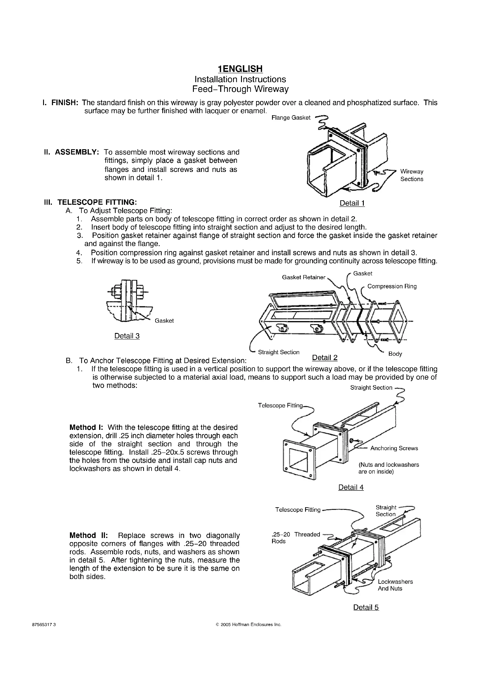 II. ASSEMBLY: To assemble most wireway sections and fittings, simply place a gasket between flanges and install screws and nuts as shown in detail 1.