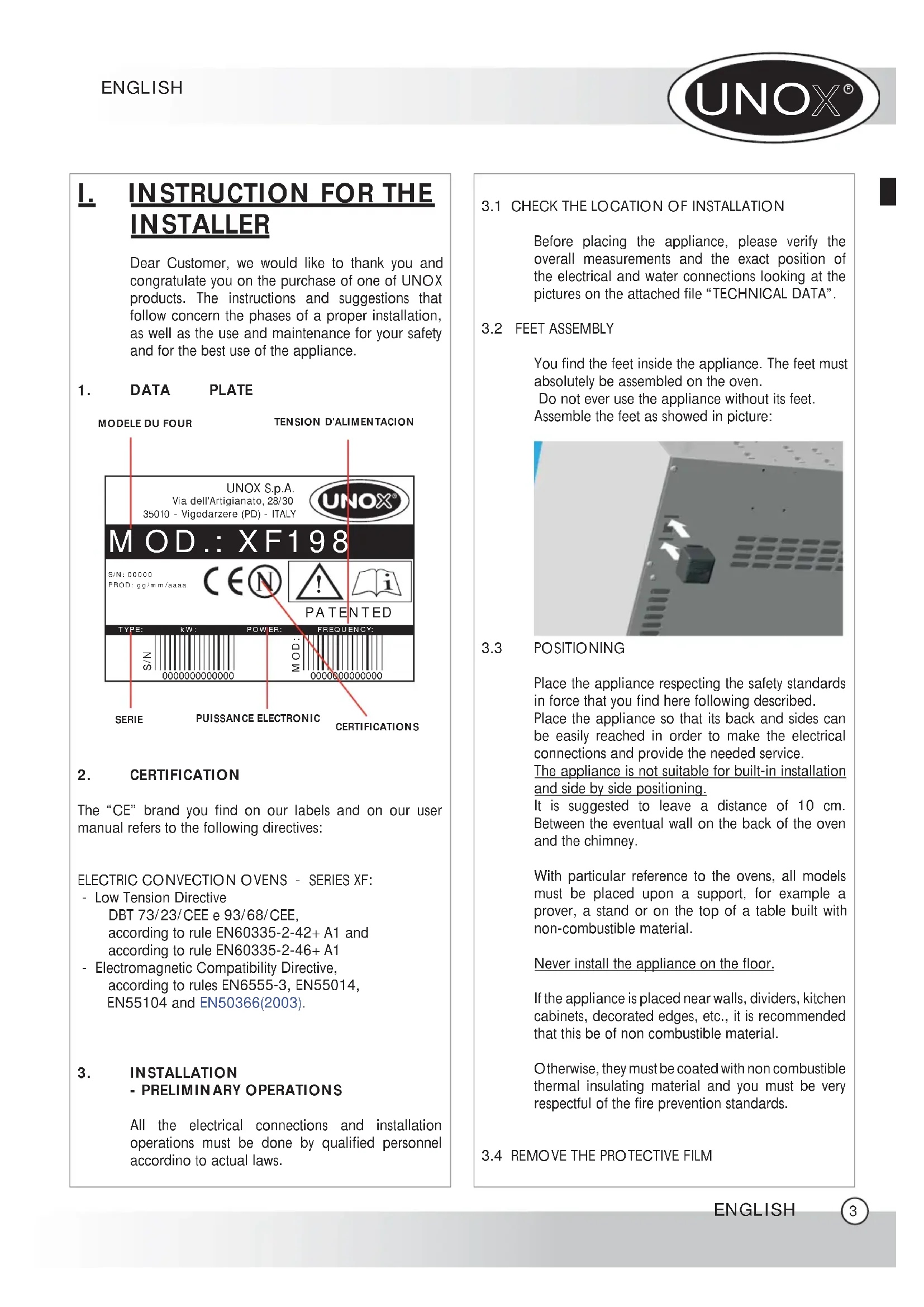 INSTALLER Dear Customer, we would like to thank you and congratulate you on the purchase of one of UNOX products. The instructions and suggestions that follow concern the phases of a proper installation, as well as the use and maintenance for your safety and for the best use of the appliance. 1. DATA PLATE2. CERTIFICATIONThe “CE” brand you find on our labels and on our user manual refers to the following directives: ELECTRIC CONVECTION OVENS - SERIES XF: - Low Tension Directive DBT 73/23/CEE e 93/68/CEE, according to rule EN60335-2-42+A1 andaccording to rule EN60335-2-46+A1- Electromagnetic Compatibility Directive, according to rules EN6555-3, EN55014, EN55104 and EN50366(2003).3. INSTALLATION - PRELIMINARY OPERATIONSAll the electrical connections and installation operations must be done by qualified personnel accordino to actual laws. 3.1 CHECK THE LOCATION OF INSTALLATIONBefore placing the appliance, please verify the overall measurements and the exact position of the electrical and water connections looking at the pictures on the attached file “TECHNICAL DATA”.3.2 FEET ASSEMBLY You find the feet inside the appliance. The feet must absolutely be assembled on the oven. Do not ever use the appliance without its feet.Assemble the feet as showed in picture:3.3 POSITIONING Place the appliance respecting the safety standards in force that you find here following described.Place the appliance so that its back and sides can be easily reached in order to make the electrical connections and provide the needed service.The appliance is not suitable for built-in installation and side by side positioning.It is suggested to leave a distance of 10 cm. Between the eventual wall on the back of the oven and the chimney.With particular reference to the ovens, all models must be placed upon a support, for example a prover, a stand or on the top of a table built with non-combustible material.Never install the appliance on the floor.If the appliance is placed near walls, dividers, kitchen cabinets, decorated edges, etc., it is recommended that this be of non combustible material. Otherwise, they must be coated with non combustible thermal insulating material and you must be very respectful of the fire prevention standards. 3.4 REMOVE THE PROTECTIVE FILM ENGLISH ENGLISH