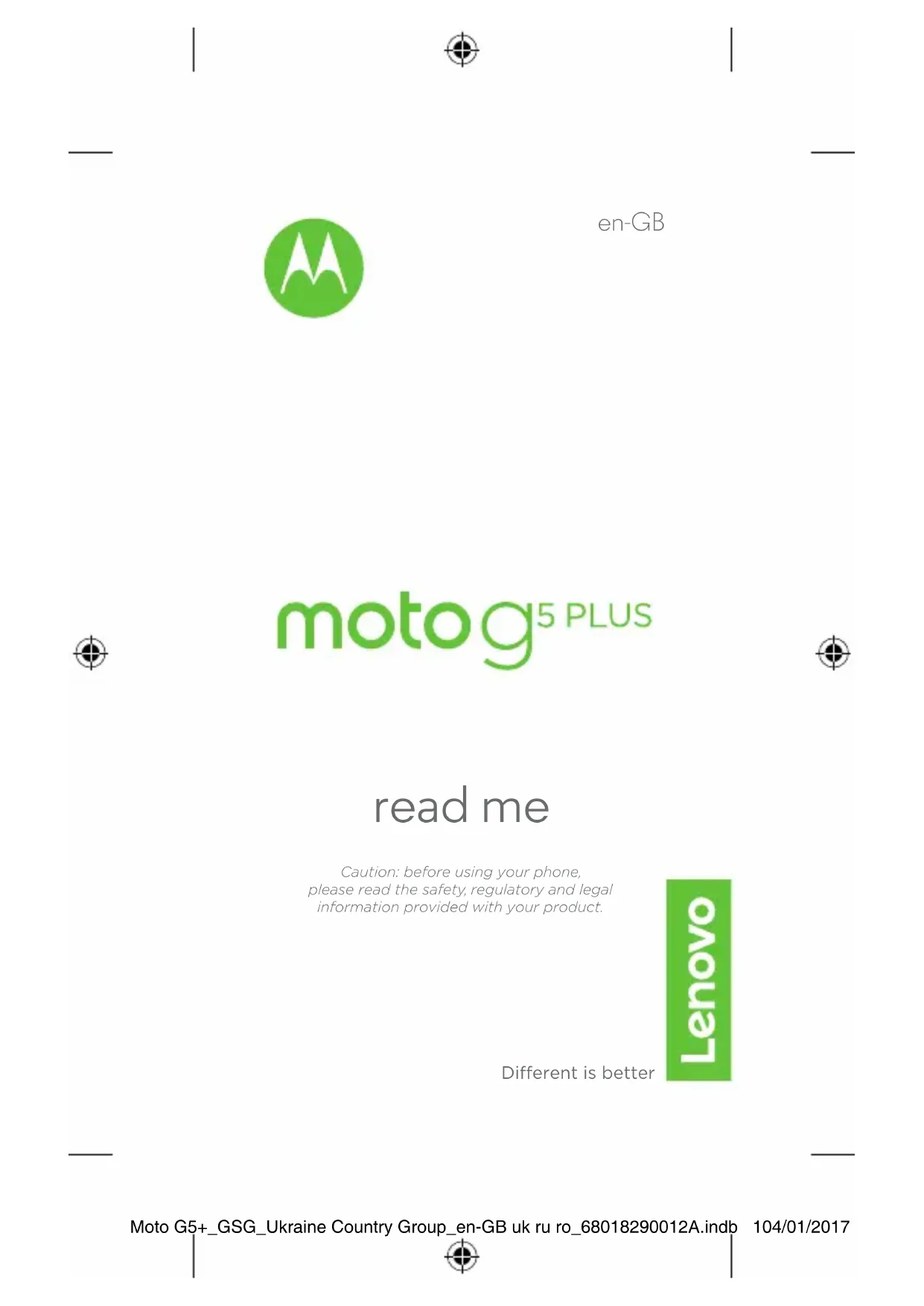 en-GB read me Dierent is better Caution: before using your phone, please read the safety, regulatory and legal information provided with your product. Moto G5+_GSG_Ukraine Country Group_en-GB uk ru ro_68018290012A.indb 104/01/2017 16:08:07This product meets the applicable national or international RF exposure guidance (SAR guideline) when used normally against your ear, or when worn or carried, at a distance of 0.5cm from the body. The SAR guideline includes a considerable safety margin designed to ensure the safety of all persons, regardless of age and health. To view the SAR values for your phone, visit https://motorola.com/sar. To view additional SAR information on your phone, swipe up > Settings > Legal information > RF information. To view the information on the web, visit www.motorola.com/rfhealth. Moto G5+_GSG_Ukraine Country Group_en-GB uk ru ro_68018290012A.indb 204/01/2017 16:08:08At a glance 1 At a glance Let's get started. We'll guide you through startup and tell you about your phone. Note: software updates happen frequently, so your phone may look a little dierent. 11:35Play StoreCalendarGoogle Moto USB/ Charger Microphone Headset Jack SIM & microSD Card Slots Volume Buttons Power Button Front Camera Press: Display on/o. Press & hold: Phone on/o. Back Home Overview Fingerprint Sensor Back Camera Moto G5+_GSG_Ukraine Country Group_en-GB uk ru ro_68018290012A.indb 104/01/2017 16:08:102 Put in the cards Put in the cards Your phone supports two SIM cards. Caution: make sure you use the correct size and don't cut the SIM card. Nano SIMPush the tray back into your phone.Put in the nano SIM and memory cards. Put in the SIM cards with the gold contacts facing up. Put in an optional microSD card on the back of the tray.With the phone facing down, insert the SIM tool into the tray hole to pop out the tray. (optional) SIM 2SIM 1Tray frontTray backmicroSD (optional) Moto G5+_GSG_Ukraine Country Group_en-GB uk ru ro_68018290012A.indb 204/01/2017 16:08:13Charge up and power on 3 Charge up and power on Connect your charger to charge your phone fully and turn the power on. Then select your language and follow the screen prompts to get started. For phones that use two SIM cards, follow the prompts to set them up. Before using your phone, fully charge it with the charger provided. Charge up. Power on. Press and hold Power until the screen lights up. Moto G5+_GSG_Ukraine Country Group_en-GB uk ru ro_68018290012A.indb 304/01/2017 16:08:144 Control with one touch Control with one touch Lock, unlock and navigate your phone and make mobile purchases with just one touch.