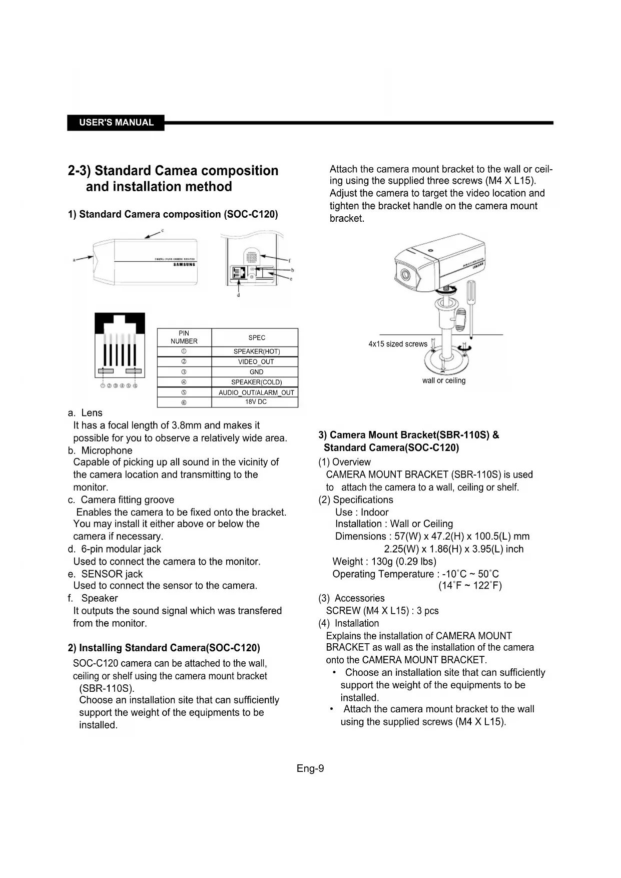 Standard Camera(SOC-C120) (1) Overview CAMERA MOUNT BRACKET (SBR-110S) is used to attach the camera to a wall, ceiling or shelf. (2)Specications Use : Indoor Installation : Wall or Ceiling Dimensions : 57(W) x 47.2(H) x 100.5(L) mm 2.25(W) x 1.86(H) x 3.95(L) inch Weight : 130g (0.29 lbs) OperatingTemperature:-10˚C~50˚C (14˚F~122˚F) (3) Accessories SCREW (M4 X L15) : 3 pcs (4) Installation Explains the installation of CAMERA MOUNT BRACKET as wall as the installation of the camera onto the CAMERA MOUNT BRACKET.