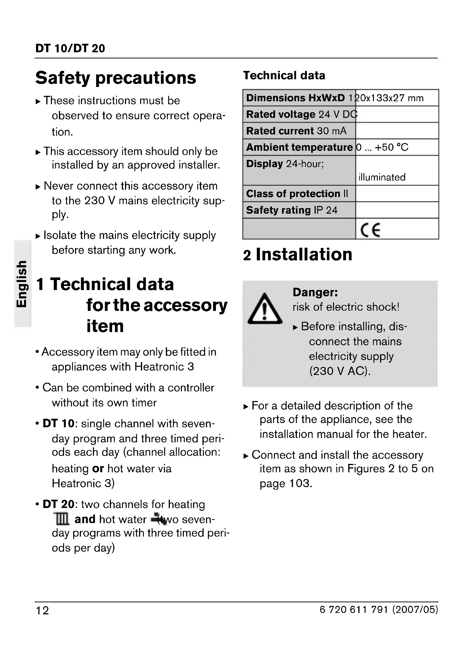 risk of electric shock! B Before installing, dis- connect the mains electricity supply (230 V AC).13 DT 10/DT 20 6 720 611 791 (2007/05) English 3 Operation