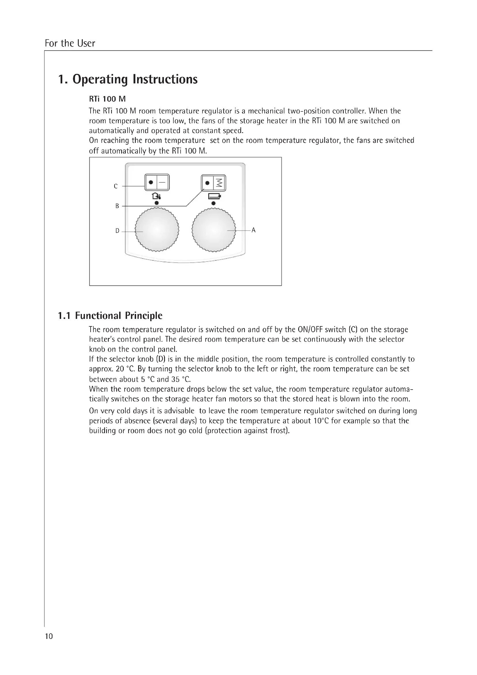 The RTi 100 M room temperature regulator is a mechanical two-position controller. When the room temperature is too low, the fans of the storage heater in the RTi 100 M are switched on automatically and operated at constant speed.