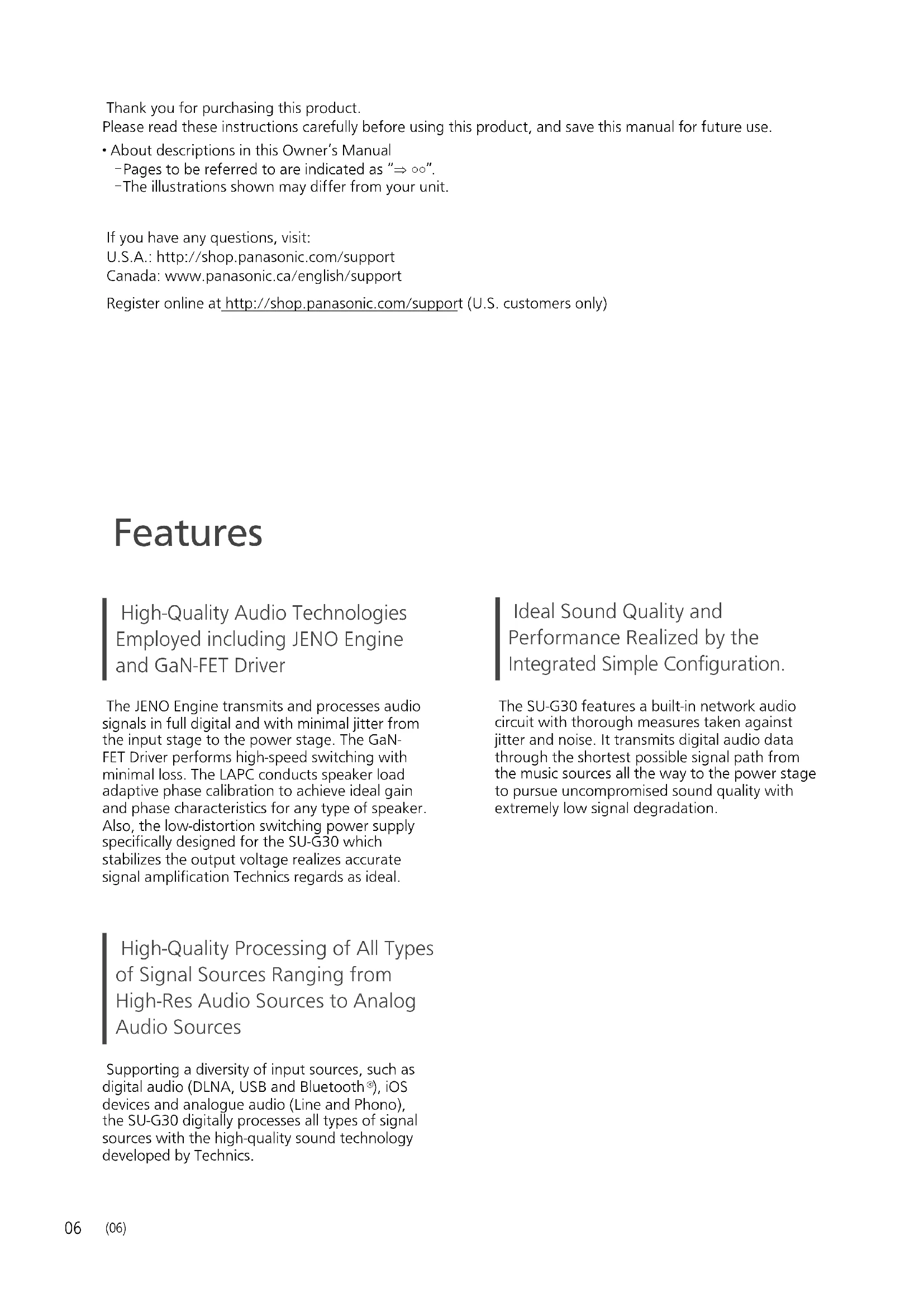 - About descriptions in this Owner’s Manual - Pages to be referred to are indicated as “ ○○”. - The illustrations shown may differ from your unit. If you have any questions, visit: U.S.A.: http://shop.panasonic.com/support Canada: www.panasonic.ca/english/support Register online at http://shop.panasonic.com/support (U.S. customers only) High-Quality Audio Technologies Employed including JENO Engine and GaN-FET Driver The JENO Engine transmits and processes audio signals in full digital and with minimal jitter from the input stage to the power stage. The GaN- FET Driver performs high-speed switching with minimal loss. The LAPC conducts speaker load adaptive phase calibration to achieve ideal gain and phase characteristics for any type of speaker. Also, the low-distortion switching power supply specifically designed for the SU-G30 which stabilizes the output voltage realizes accurate signal amplification Technics regards as ideal. High-Quality Processing of All Types of Signal Sources Ranging from High-Res Audio Sources to Analog Audio Sources Supporting a diversity of input sources, such as digital audio (DLNA, USB and Bluetooth