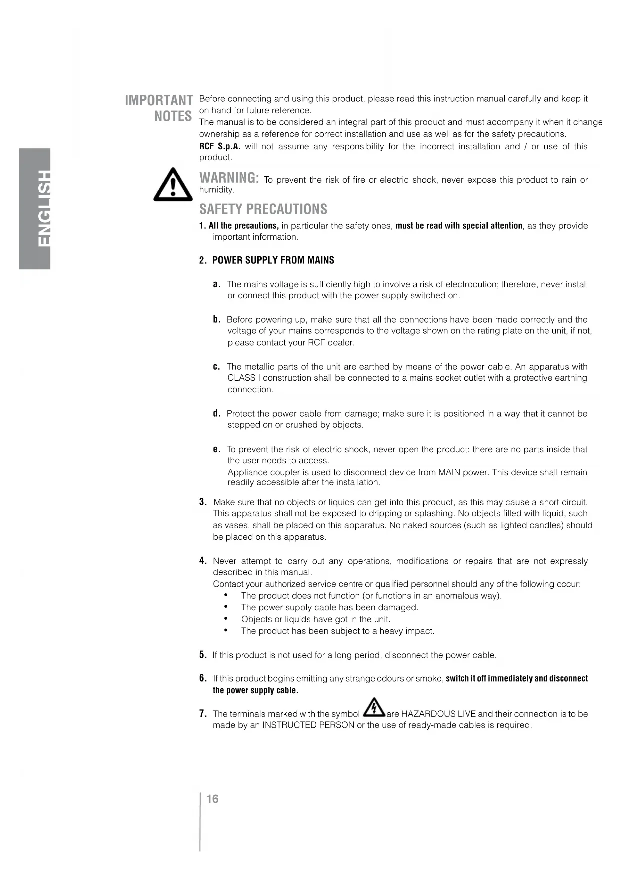 RCF S.p.A. will not assume any responsibility for the incorrect installation and / or use of this product.