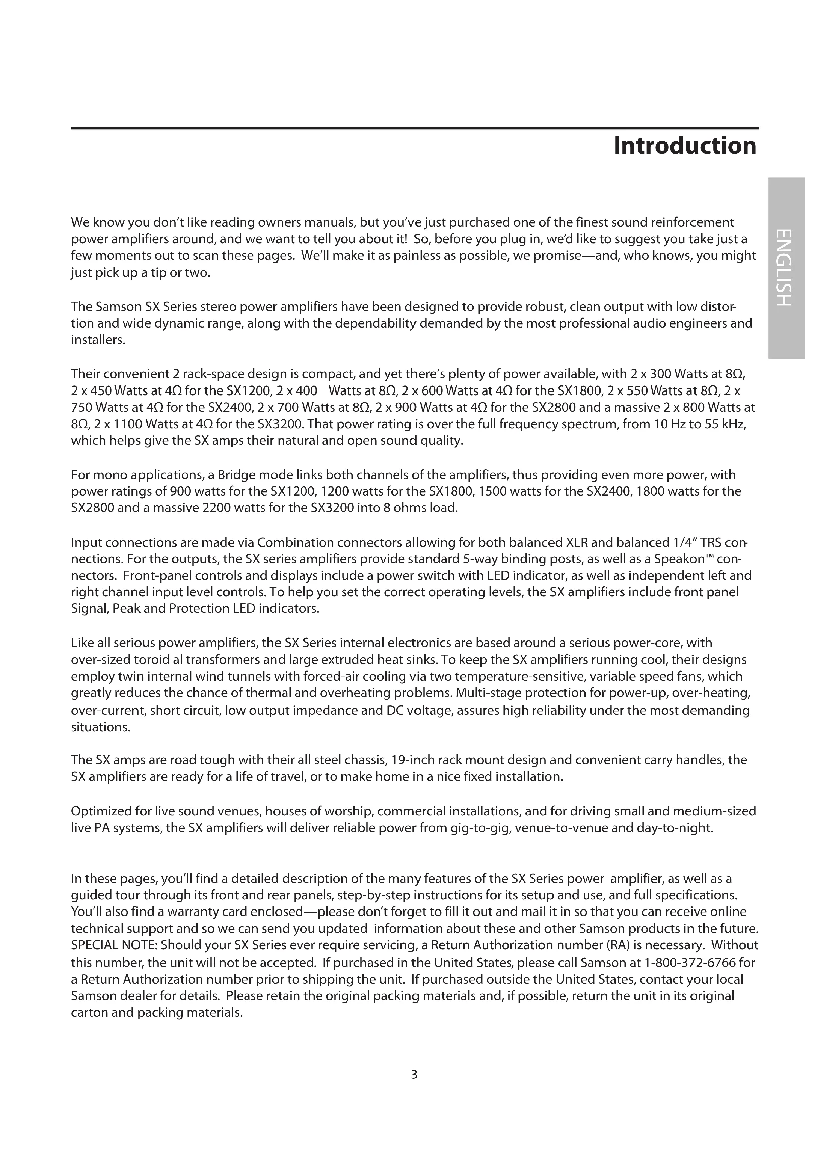 In these pages, you'll find a detailed description of the many features of the SX Series power amplifier, as well as a guided tour through its front and rear panels, step-by-step instructions for its setup and use, and full specifications. You'll also find a warranty card enclosed—please don't forget to fill it out and mail it in so that you can receive online technical support and so we can send you updated information about these and other Samson products in the future. SPECIAL NOTE: Should your SX Series ever require servicing, a Return Authorization number (RA) is necessary. Without this number, the unit will not be accepted. If purchased in the United States, please call Samson at 1-800-372-6766 for a Return Authorization number prior to shipping the unit. If purchased outside the United States, contact your local Samson dealer for details. Please retain the original packing materials and, if possible, return the unit in its original carton and packing materials.