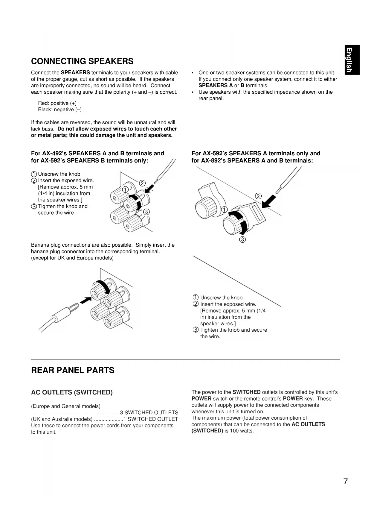 Connect the SPEAKERS terminals to your speakers with cable of the proper gauge, cut as short as possible. If the speakers are improperly connected, no sound will be heard. Connect each speaker making sure that the polarity (+ and –) is correct. Red: positive (+) Black: negative (–) If the cables are reversed, the sound will be unnatural and will lack bass. Do not allow exposed wires to touch each other or metal parts; this could damage the unit and speakers. For AX-492’s SPEAKERS A and B terminals and for AX-592’s SPEAKERS B terminals only: