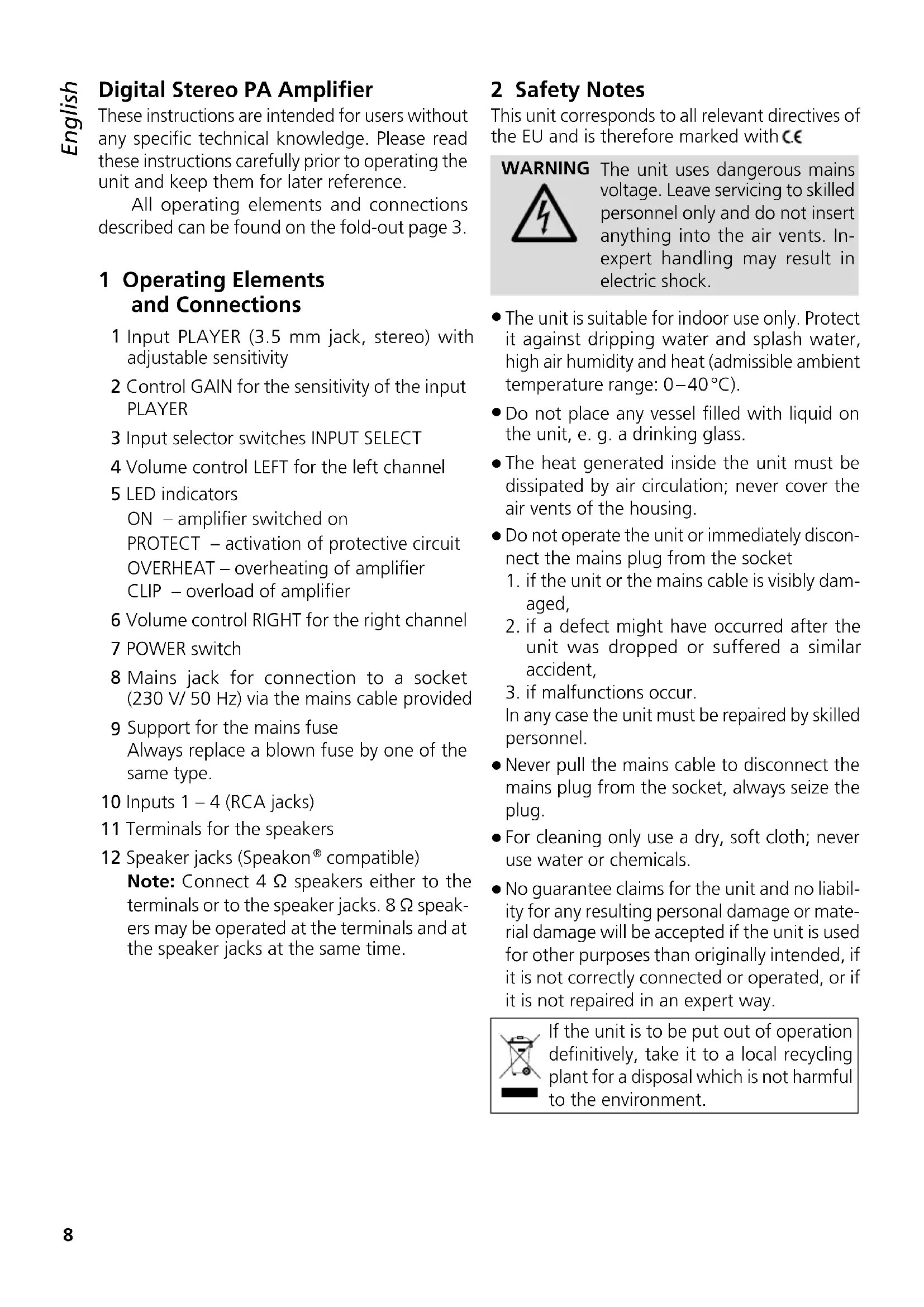 No guarantee claims for the unit and no liabil- ity for any resulting personal damage or mate- rial damage will be accepted if the unit is used for other purposes than originally intended, if it is not correctly connected or operated, or if it is not repaired in an expert way. If the unit is to be put out of operation definitively, take it to a local recycling plant for a disposal which is not harmful to the environment.9 English 3 Applications This digital stereo PA amplifier with a peak power of 300 W is specially designed, for example, for applications on stage and in discothèques. It allows connection of up to five audio units to be selected via input switches. 4 Setting Up / Installation The amplifier is designed for installation into a rack (482 mm / 19”); however, it can also be used as a table-top unit. In order to ensure sufficient cooling, air must always be able to flow freely through all air vents.