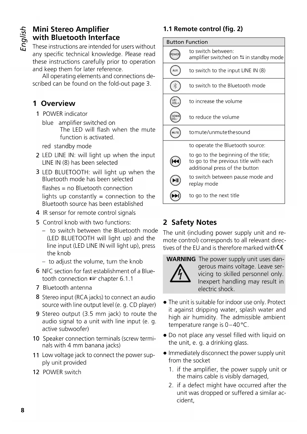 To switch between the operating modes, press the control knob (5) at the amplifier or use the corresponding button on the remote control (button AUX = source at the line input, button 串 = Bluetooth mode).