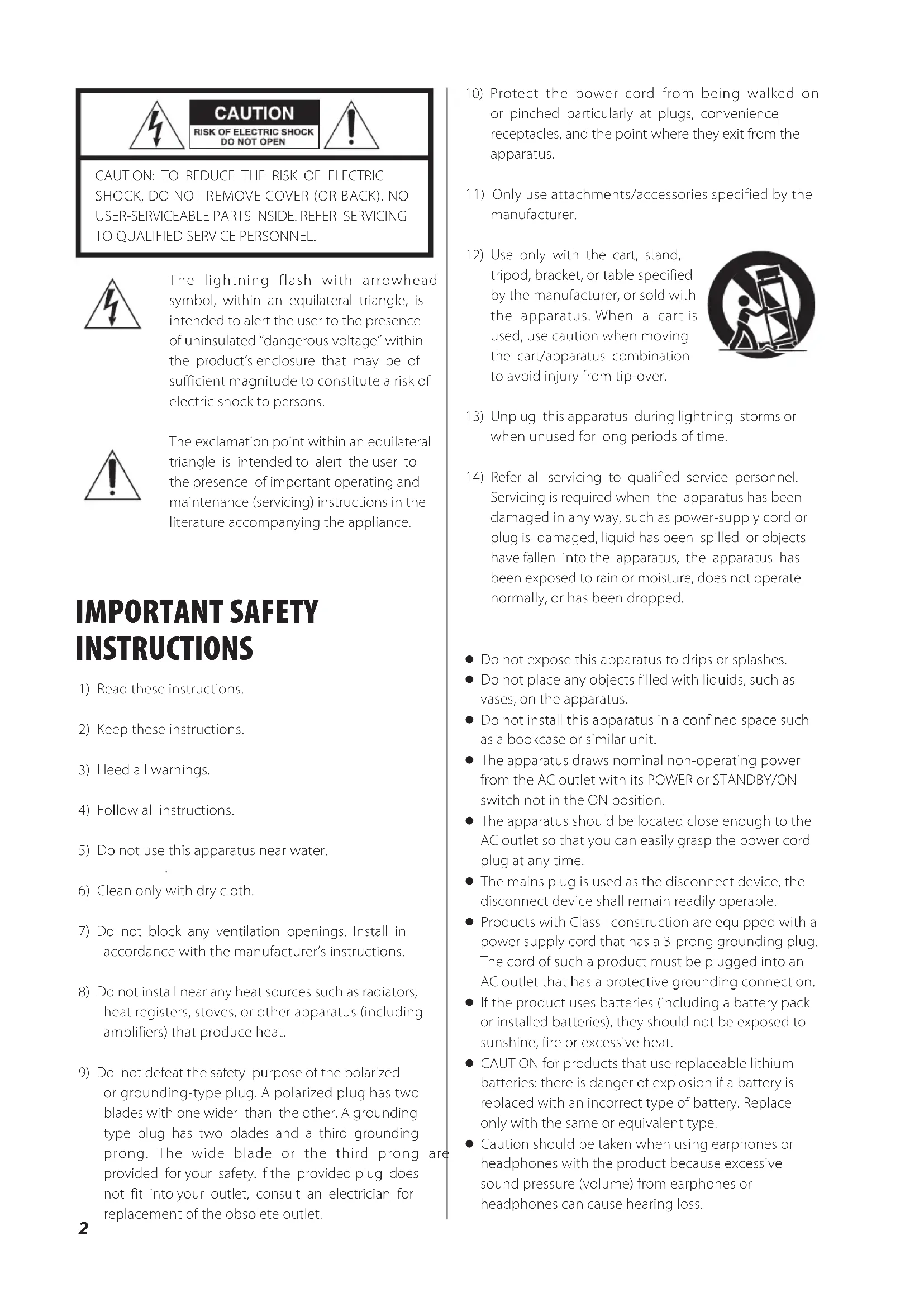 Servicing is required when the apparatus has been damaged in any way, such as power-supply cord or plug is damaged, liquid has been spilled or objects have fallen into the apparatus, the apparatus has been exposed to rain or moisture, does not operate normally, or has been dropped. The lightning flash with arrowhead symbol, within an equilateral triangle, is intended to alert the user to the presence of uninsulated “dangerous voltage” within the product’s enclosure that may be of sufficient magnitude to constitute a risk of electric shock to persons. The exclamation point within an equilateral triangle is intended to alert the user to the presence of important operating and maintenance (servicing) instructions in the literature accompanying the appliance. CAUTION: TO REDUCE THE RISK OF ELECTRIC SHOCK, DO NOT REMOVE COVER (OR BACK). NO