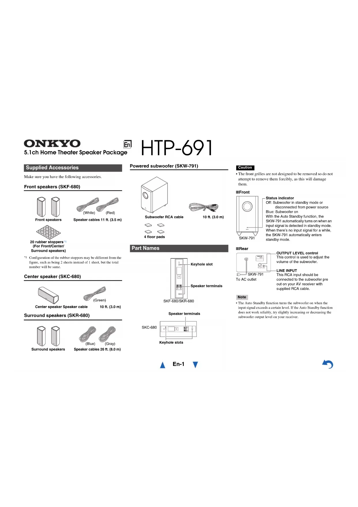 (For Front/Center/Surround speakers)Center speaker Speaker cable 10 ft. (3.0 m)Surround speakersSpeaker cables 26 ft. (8.0 m)(White)(Red)(Green)(Blue)(Gray)Subwoofer RCA cable 10 ft. (3.0 m) 4 floor pads Part Names Speaker terminals Keyhole slot SKF-680/SKR-680Speaker terminals Keyhole slots SKC-680Status indicatorOff: Subwoofer in standby mode or disconnected from power sourceBlue: Subwoofer onWith the Auto Standby function, the SKW-791 automatically turns on when an input signal is detected in standby mode. When there’s no input signal for a while, the SKW-791 automatically enters standby mode.SKW-791To AC outletOUTPUT LEVEL controlThis control is used to adjust the volume of the subwoofer.LINE INPUTThis RCA input should be connected to the subwoofer pre out on your AV receiver with supplied RCA cable.SKW-791 HTP-691En-2 Using the Rubber Stoppers for a More Stable Platform We recommend using the supplied rubber stoppers to achieve the best possible sound from your speakers. The rubber stoppers prevent the speakers from moving, providing a more stable platform. Using the Floor Pads for Subwoofer If the subwoofer is placed on a hard floor (wood, vinyl, tile, etc.) and playback is very loud, the subwoofer’s feet may damage the flooring. To prevent this, place the supplied pads underneath the subwoofer’s feet. The pads also provide a stable base for the subwoofer. Setting the Subwoofer Level To set the level of the subwoofer, use the OUTPUT LEVEL control. Set it so that bass sounds are evenly balanced with the treble sounds from the other speakers. Because our ears are less sensitive to very low bass sounds, there’s a temptation to set the level of the subwoofer too high. As a rule of thumb, set the subwoofer level to what you think is the optimal level, and then back it off slightly. Wall Mounting To mount the front/surround speakers vertically, use the keyhole slot shown to hang each speaker on a screw that’s securely screwed into the wall. To mount the center speaker horizontally, use the two keyhole slots shown to hang the speaker on two screws that are securely screwed into the wall. Tip