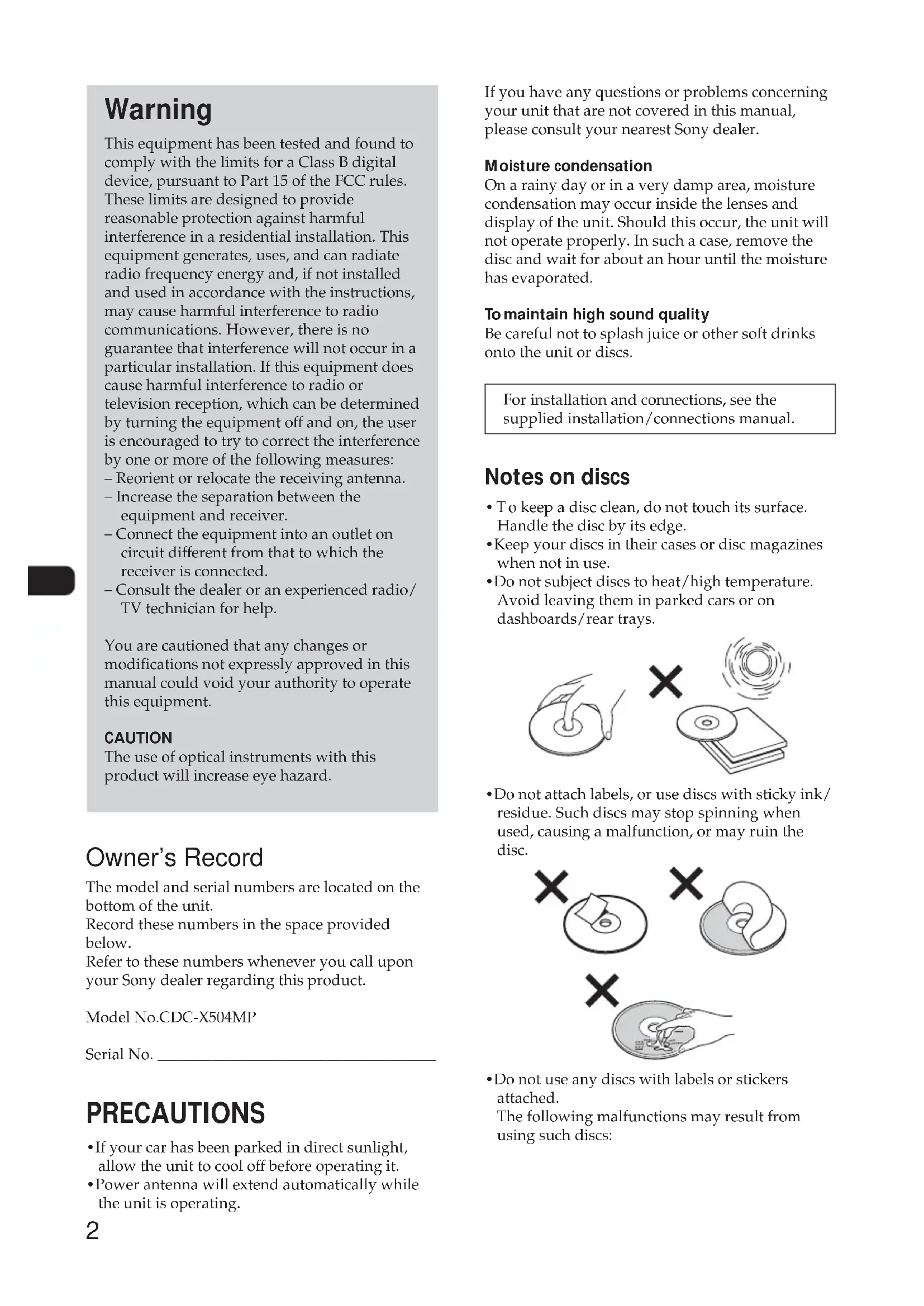- Do not use any discs with labels or stickers attached. The following malfunctions may result from using such discs: Warning This equipment has been tested and found to comply with the limits for a Class B digital device, pursuant to Part 15 of the FCC rules. These limits are designed to provide reasonable protection against harmful interference in a residential installation. This equipment generates, uses, and can radiate radio frequency energy and, if not installed and used in accordance with the instructions, may cause harmful interference to radio communications. However, there is no guarantee that interference will not occur in a particular installation. If this equipment does cause harmful interference to radio or television reception, which can be determined by turning the equipment off and on, the user is encouraged to try to correct the interference by one or more of the following measures: – Reorient or relocate the receiving antenna. – Increase the separation between the equipment and receiver. – Connect the equipment into an outlet on circuit different from that to which the receiver is connected. – Consult the dealer or an experienced radio/ TV technician for help. You are cautioned that any changes or modifications not expressly approved in this manual could void your authority to operate this equipment. CAUTION The use of optical instruments with this product will increase eye hazard. Owner’s Record The model and serial numbers are located on the bottom of the unit. Record these numbers in the space provided below. Refer to these numbers whenever you call upon your Sony dealer regarding this product. Model No.CDC-X504MP Serial No. ____________________________________ PRECAUTIONS