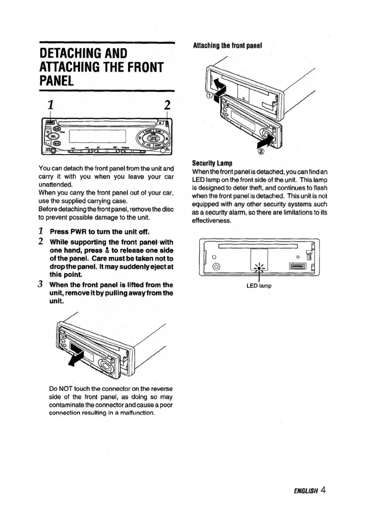 Security Lamp When the front panel is detached, you can find an LED lamp on the front side of the unit. This lamp is designed to deter theft, and continues to flash when the front panel is detached. This unit is not equipped with any other security systems such as a securiw alarm, so there are limitations to its effectiveness.LED’lamp Do NOT touch the connector on the reverse side of the front panel, as doing so may contaminate the connector and cause a poor connection resulting in a malfunction. ENGLISH