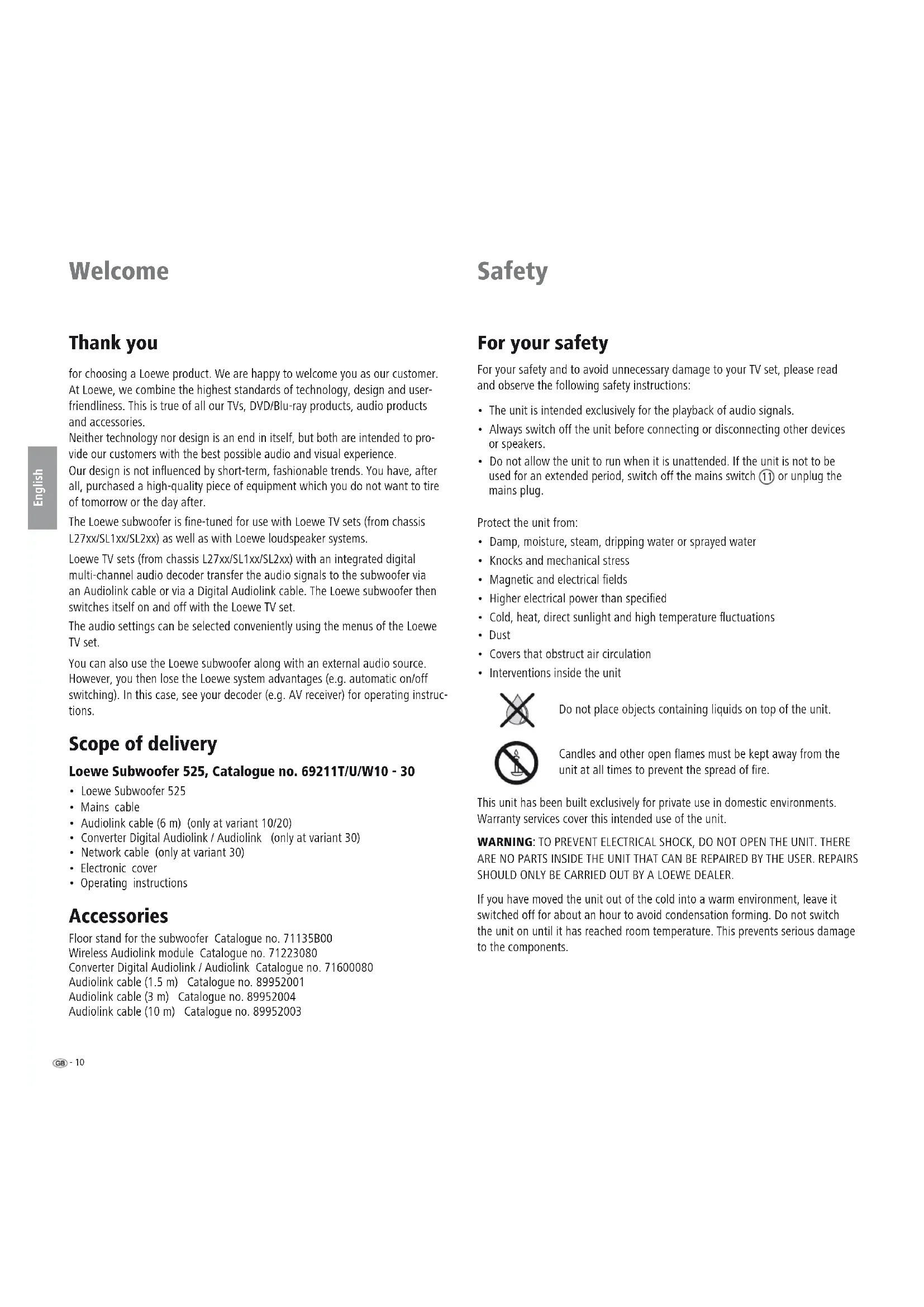 However, you then lose the Loewe system advantages (e.g. automatic on/off switching). In this case, see your decoder (e.g. AV receiver) for operating instruc- tions. Scope of delivery Loewe Subwoofer 525, Catalogue no. 69211T/U/W10 - 30
