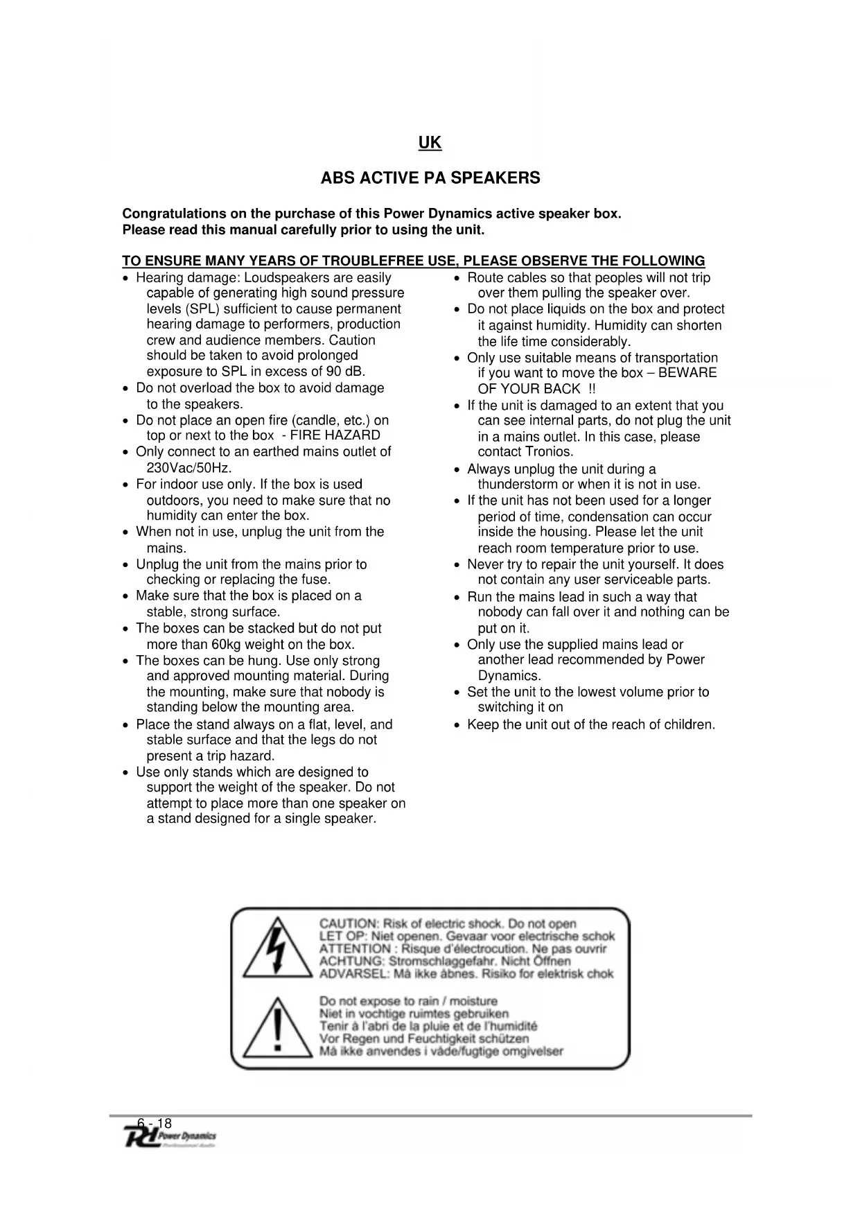Congratulations on the purchase of this Power Dynamics active speaker box. Please read this manual carefully prior to using the unit. TO ENSURE MANY YEARS OF TROUBLEFREE USE, PLEASE OBSERVE THE FOLLOWING
