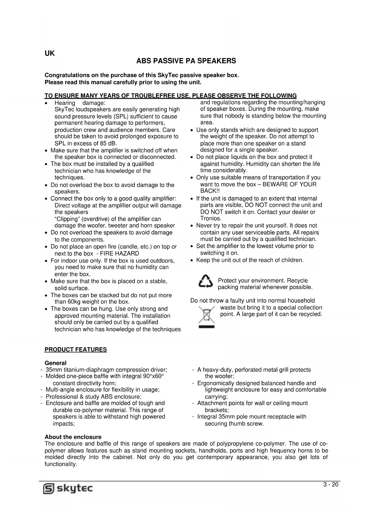- Hearing damage: SkyTec loudspeakers are easily generating high sound pressure levels (SPL) sufficient to cause permanent hearing damage to performers, production crew and audience members. Care should be taken to avoid prolonged exposure to SPL in excess of 85 dB.