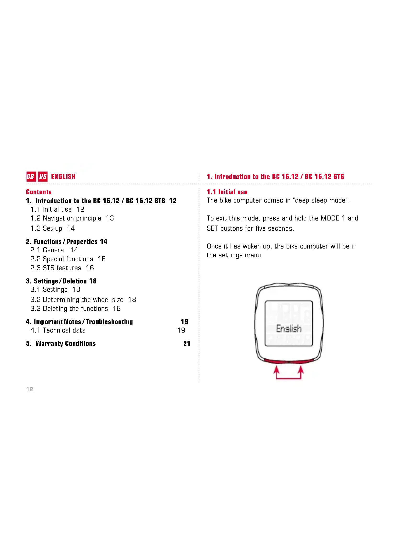 GB/US We are liable to our contracting partners for defects in line with legal provisions. In the event of a warranty claim, please contact the retailer from whom you purchased your bike computer. You can also send your bike computer, together with your receipt and all accessories, to the address below. Please ensure you pay sufficient postage. Warranty claims can be made in the event of material and workmanship errors. The warranty does not cover batteries, wear and tear parts, or wear caused by commercial use or accidents. Warranty claims shall only be valid if the SIGMA product has not been opened without authorization and the purchase receipt is provided.
