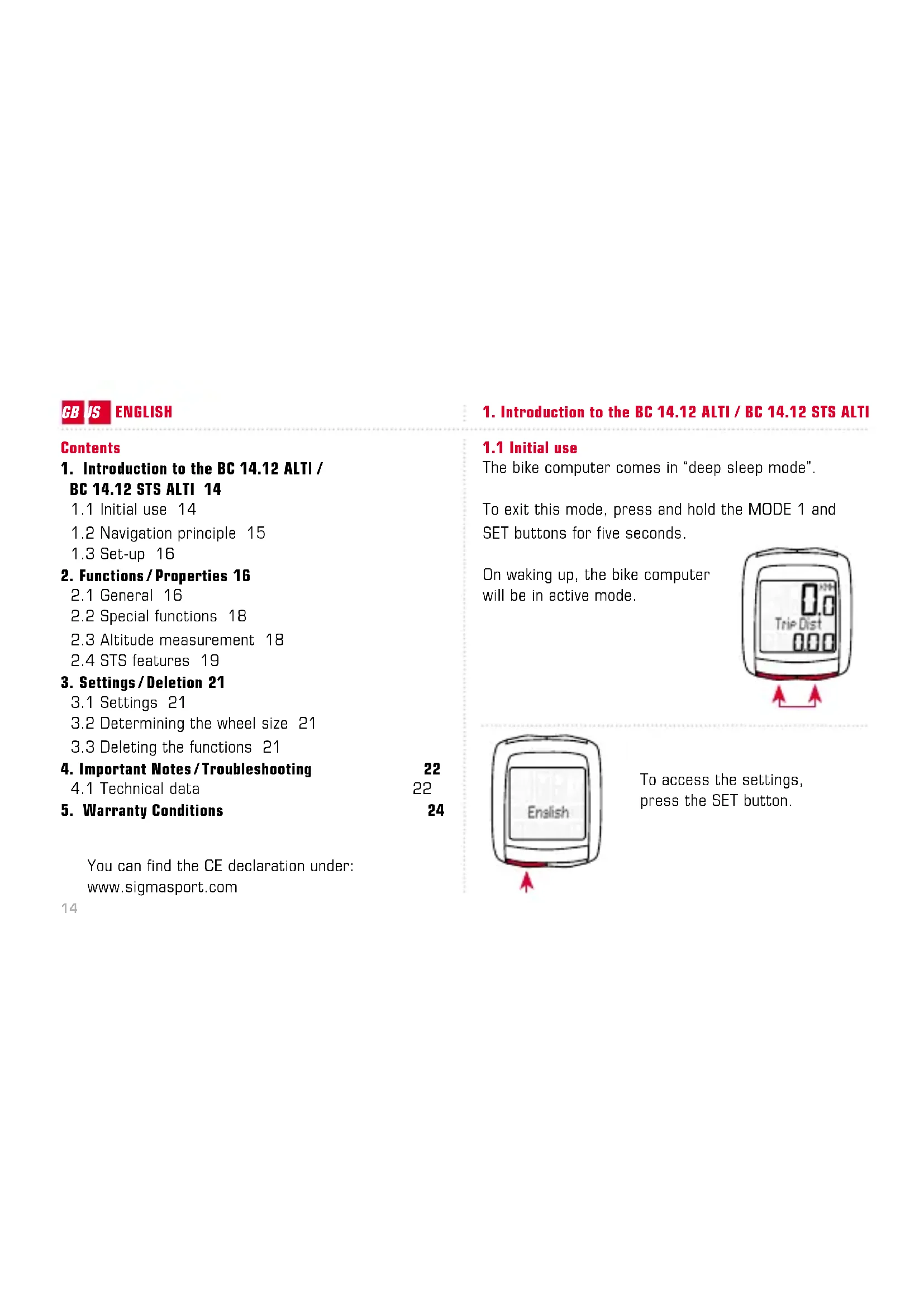 The bike computer comes in “deep sleep mode”. To exit this mode, press and hold the MODE 1 and SET buttons for five seconds. On waking up, the bike computer will be in active mode. To access the settings, press the SET button.15 GB/US