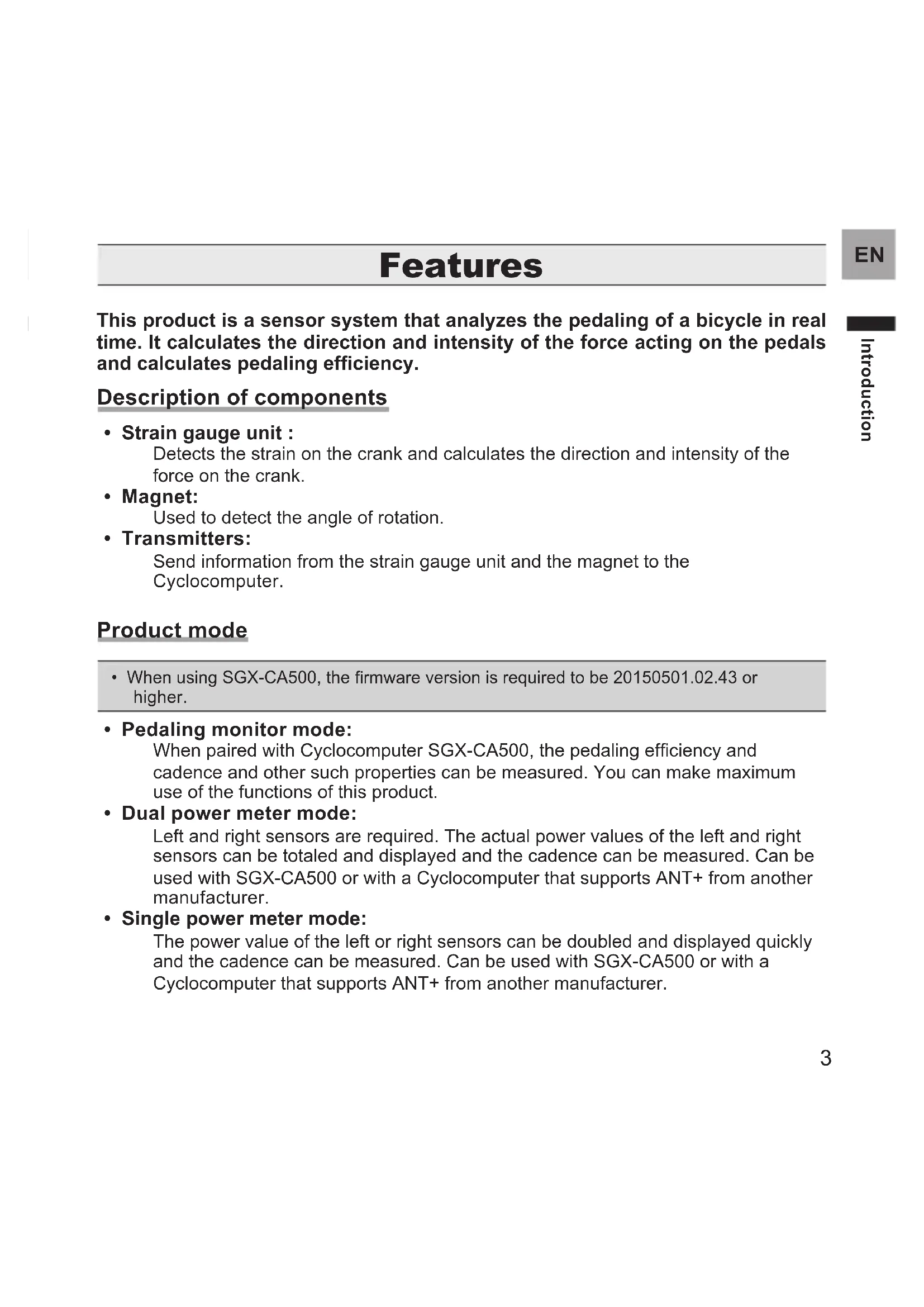 - Pedaling monitor mode: When paired with Cyclocomputer SGX-CA500, the pedaling efciency and cadence and other such properties can be measured. You can make maximum use of the functions of this product.
