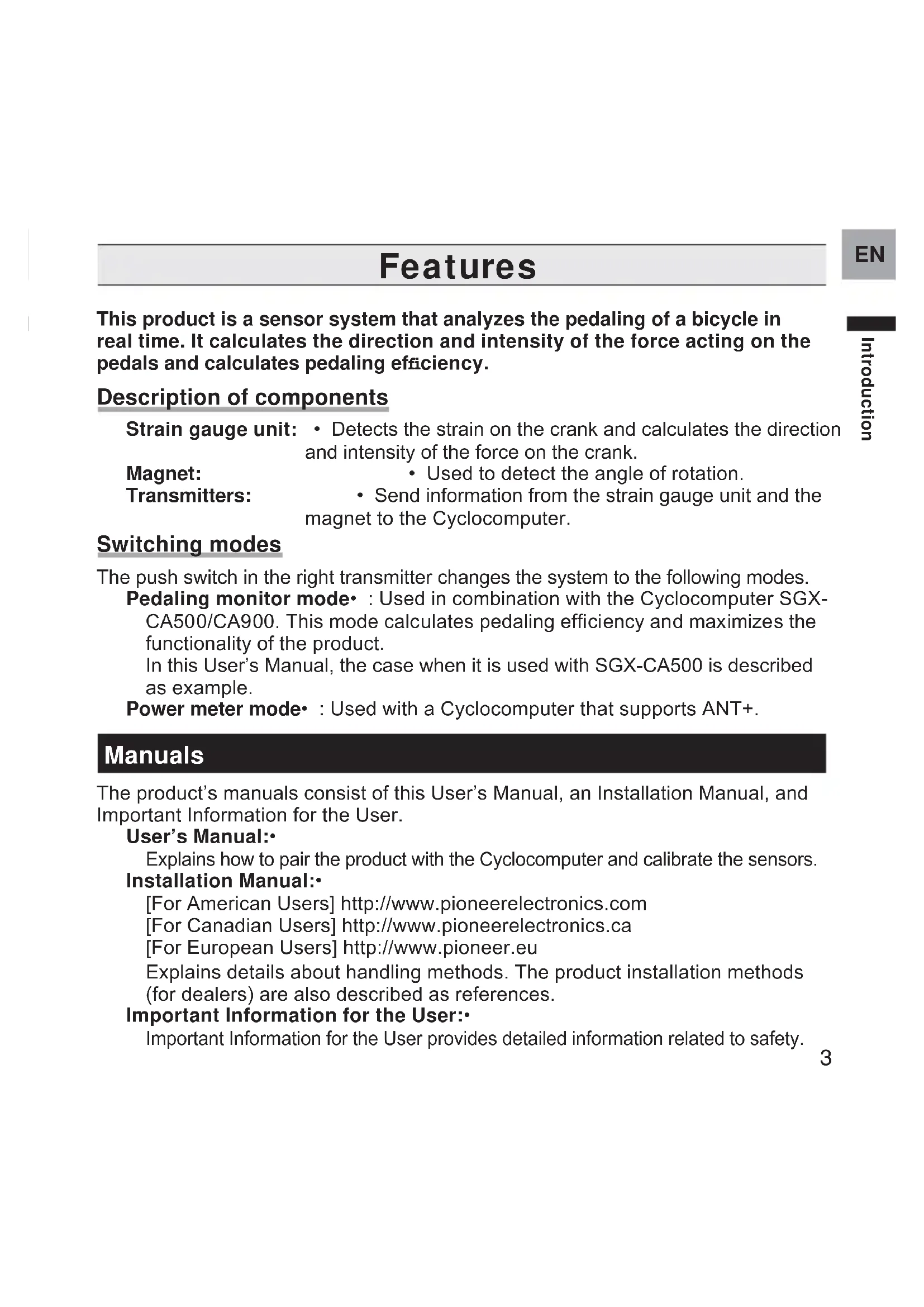 Introduction Features This product is a sensor system that analyzes the pedaling of a bicycle in real time. It calculates the direction and intensity of the force acting on the pedals and calculates pedaling efficiency. Description of components Strain gauge unit: • Detects the strain on the crank and calculates the direction and intensity of the force on the crank. Magnet: • Used to detect the angle of rotation. Transmitters: • Send information from the strain gauge unit and the magnet to the Cyclocomputer. Switching modes The push switch in the right transmitter changes the system to the following modes. Pedaling monitor mode• : Used in combination with the Cyclocomputer SGX- CA500/CA900. This mode calculates pedaling efficiency and maximizes the functionality of the product. In this User’s Manual, the case when it is used with SGX-CA500 is described as example. Power meter mode• : Used with a Cyclocomputer that supports ANT+. Manuals The product’s manuals consist of this User’s Manual, an Installation Manual, and Important Information for the User. User’s Manual:• Explains how to pair the product with the Cyclocomputer and calibrate the sensors. Installation Manual:• [For American Users] http://www.pioneerelectronics.com [For Canadian Users] http://www.pioneerelectronics.ca [For European Users] http://www.pioneer.eu Explains details about handling methods. The product installation methods (for dealers) are also described as references. Important Information for the User:• Important Information for the User provides detailed information related to safety.4